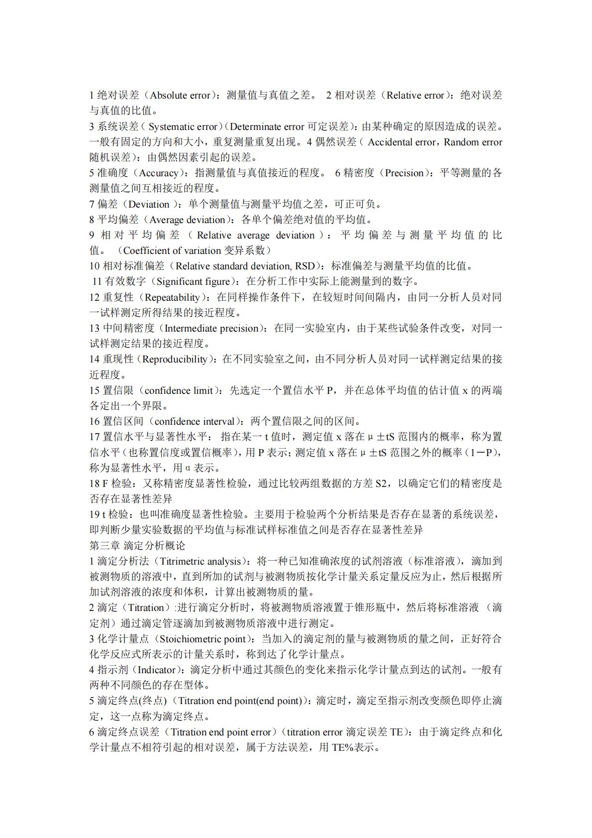 1绝对误差(Absoluteerror):测量值与真值之差。2相对误差(Relativeerror):绝对误差与真值的比值。3系统误差(Systematicerror)(Determinateerror可定误差):由某种确定的原因造成的误差。一般有固定的方向和大小,重复测量重复出现。4偶然误差(Accidentalerror,Randomerror随机误差):由偶然因素引起的误差。5准确度(Accuracy):指测量值与真值接近的程度。6精密度(Precision):平等测量的各测量值之间互相接近的程度。7偏差(Deviation):单个测量值与测量平均值之差,可正可负。8平均偏差(Avera...