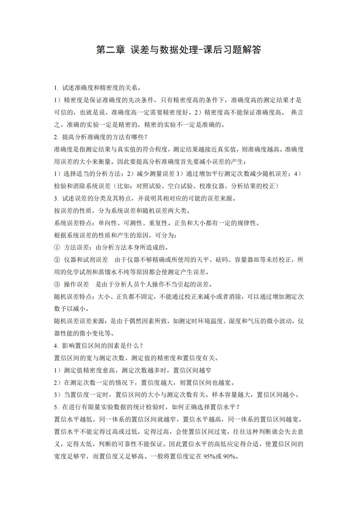 第二章误差与数据处理-课后习题解答1.试述准确度和精密度的关系。1)精密度是保证准确度的先决条件,只有精密度高的条件下,准确度高的测定结果才是可信的,也就是说,准确度高一定需要精密度好,2)精密度高不能保证准确度高。换言之,准确的实验一定是精密的,精密的实验不一定是准确的。2.提高分析准确度的方法有哪些?准确度是指测定结果与真实值的符合程度,测定结果越接近真实值,则准确度越高。准确度用误差的大小来衡量。因此要提高分析准确度首先要减小误差的产生:1)选择适当的分析方法;2)减少测量误差3)通过增加平行测定次数减少随机误差;4)检验和消除系统误差(比如:对照试验、空白试验、校准仪器、分析结果的校正...