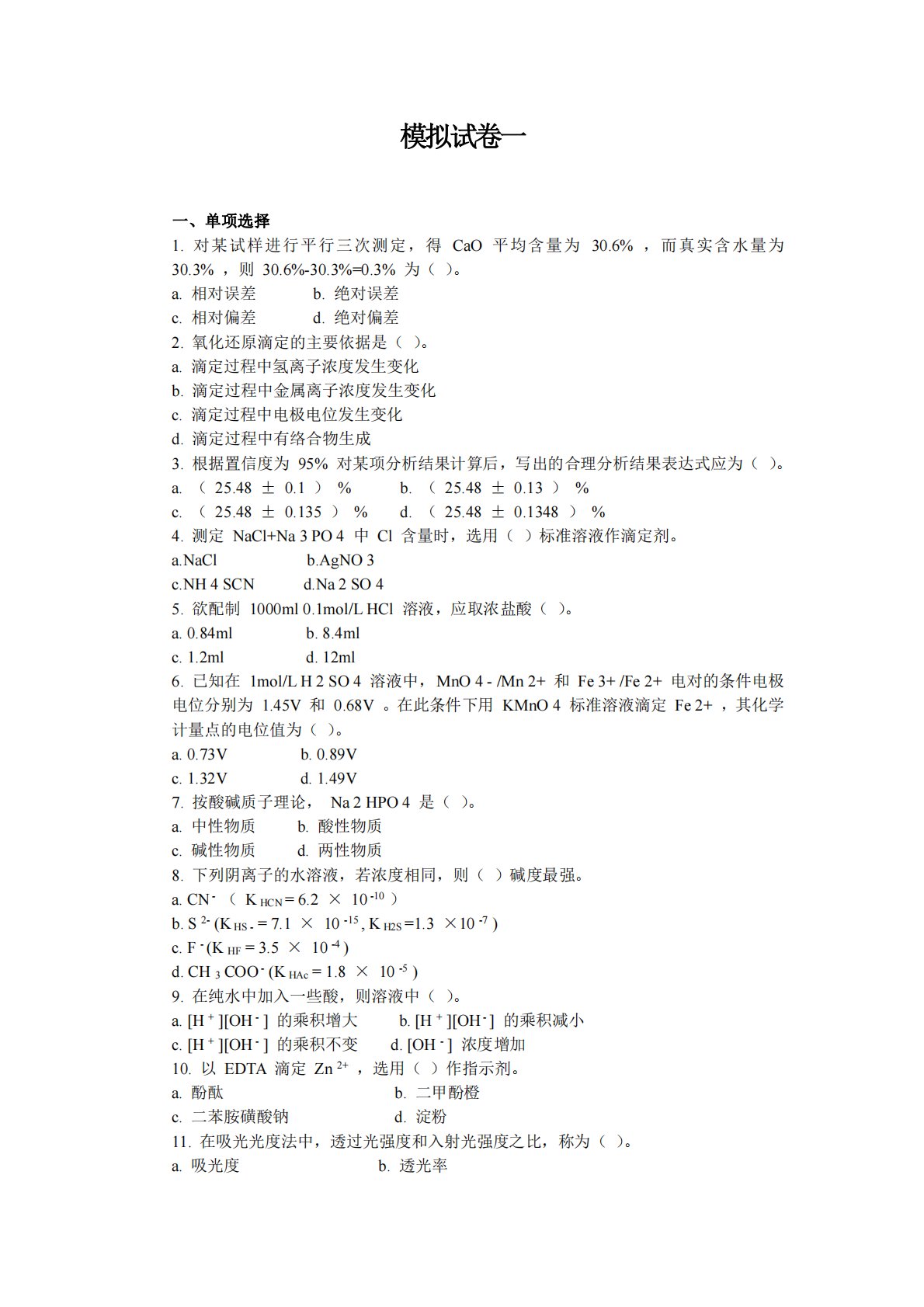 模拟试卷一一、单项选择1.对某试样进行平行三次测定,得CaO平均含量为30.6%,而真实含水量为30.3%,则30.6%-30.3%=0.3%为()。a.相对误差b.绝对误差c.相对偏差d.绝对偏差2.氧化还原滴定的主要依据是()。a.滴定过程中氢离子浓度发生变化b.滴定过程中金属离子浓度发生变化c.滴定过程中电极电位发生变化d.滴定过程中有络合物生成3.根据置信度为95%对某项分析结果计算后,写出的合理分析结果表达式应为()。a.(25.48±0.1)%b.(25.48±0.13)%c.(25.48±0.135)%d.(25.48±0.1348)%4.测定NaCl+Na3PO4中Cl含量时,...