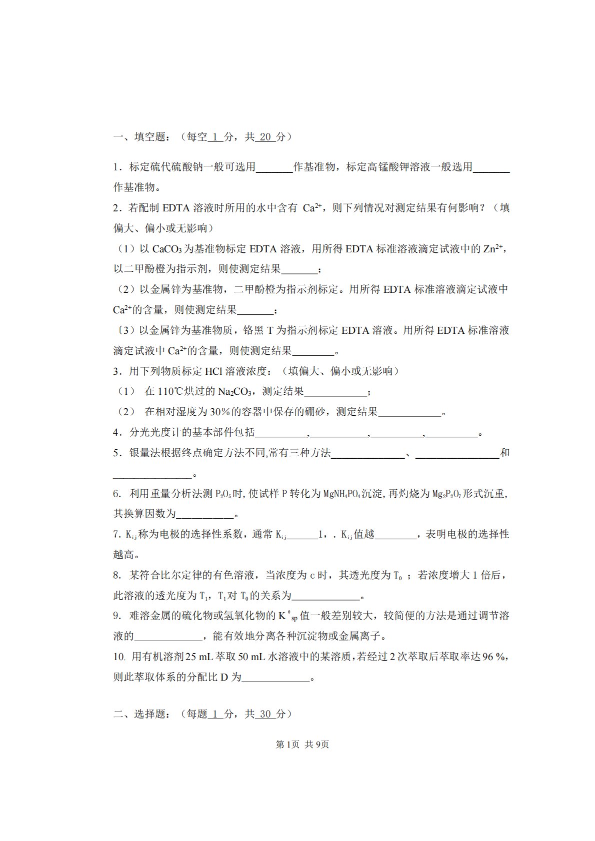 第1页共9页一、填空题:(每空1分,共20分)1.标定硫代硫酸钠一般可选用_______作基准物,标定高锰酸钾溶液一般选用_______作基准物。2.若配制EDTA溶液时所用的水中含有Ca2+,则下列情况对测定结果有何影响?(填偏大、偏小或无影响)(1)以CaCO3为基准物标定EDTA溶液,用所得EDTA标准溶液滴定试液中的Zn2+,以二甲酚橙为指示剂,则使测定结果;(2)以金属锌为基准物,二甲酚橙为指示剂标定。用所得EDTA标准溶液滴定试液中Ca2+的含量,则使测定结果;〔3)以金属锌为基准物质,铬黑T为指示剂标定EDTA溶液。用所得EDTA标准溶液滴定试液中Ca2+的含量,则使测定结果。3...
