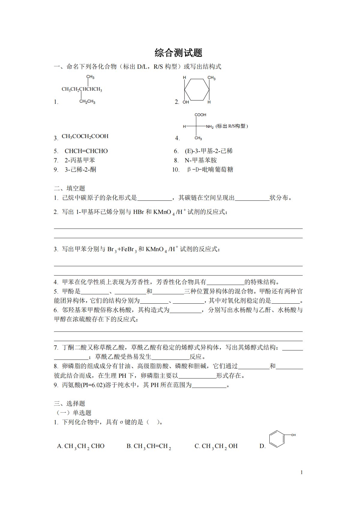 1综合测试题一、命名下列各化合物(标出D/L,R/S构型)或写出结构式1.CH3CH2CHCHCH3CH3CH2CH32.CH3HHOH3.CH3COCH2COOH4.COOHNH2HCH3(标出R/S构型)5.CHCH=CHCHO6.(E)-3-甲基-2-己稀7.2-丙基甲苯8.N-甲基苯胺9.3-己稀-2-酮10.β-D-吡喃葡萄糖二、填空题1.己烷中碳原子的杂化形式是,其碳链在空间呈现出状分布。2.写出1-甲基环己烯分别与HBr和KMnO4/H试剂的反应式:3.写出甲苯分别与Br3+FeBr3和KMnO4/H试剂的反应式:4.甲苯在化学性质上表现为芳香性,芳香性化合物具有的特殊结构。...