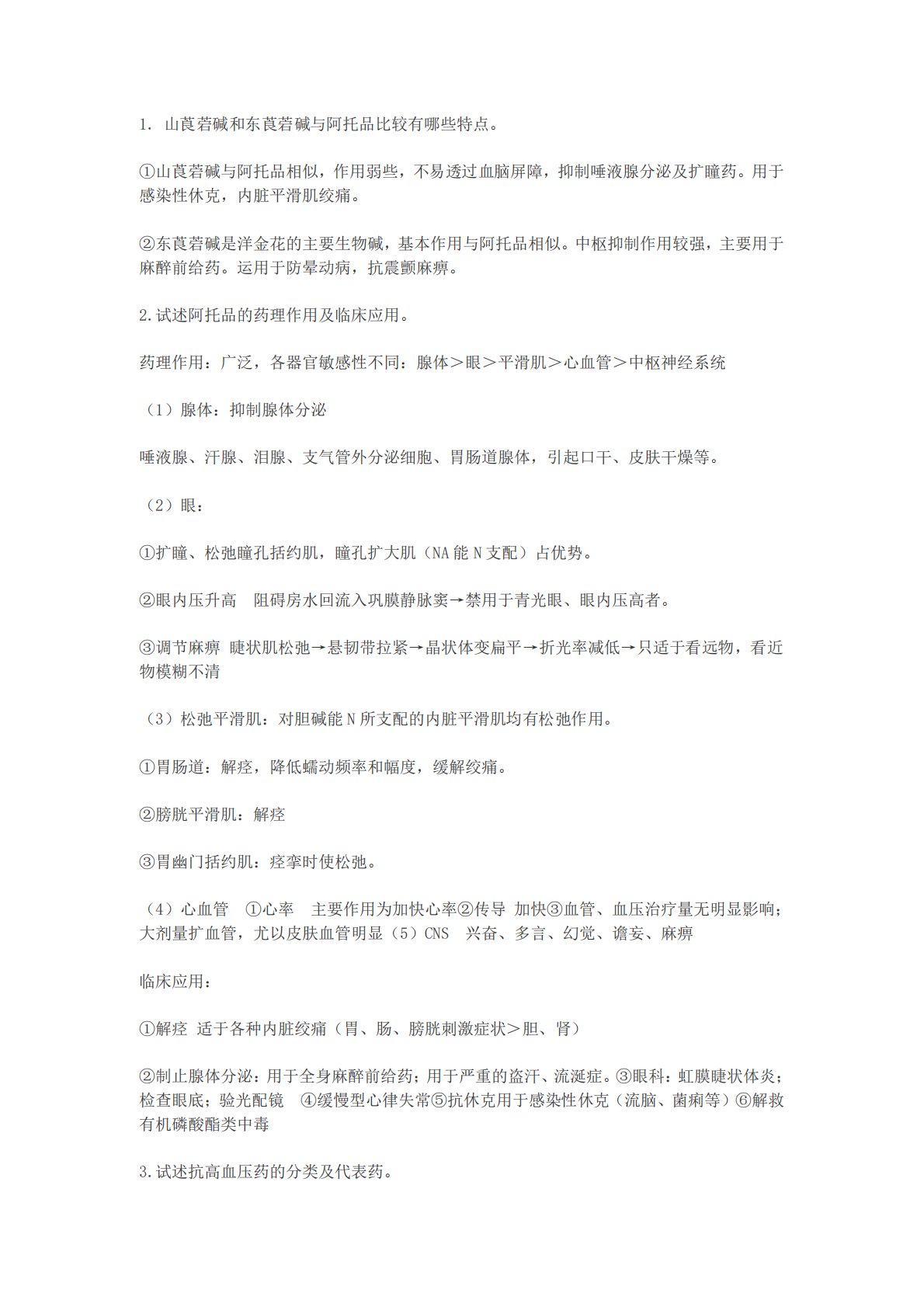 1.山莨菪碱和东莨菪碱与阿托品比较有哪些特点。①山莨菪碱与阿托品相似,作用弱些,不易透过血脑屏障,抑制唾液腺分泌及扩瞳药。用于感染性休克,内脏平滑肌绞痛。②东莨菪碱是洋金花的主要生物碱,基本作用与阿托品相似。中枢抑制作用较强,主要用于麻醉前给药。运用于防晕动病,抗震颤麻痹。2.试述阿托品的药理作用及临床应用。药理作用:广泛,各器官敏感性不同:腺体>眼>平滑肌>心血管>中枢神经系统(1)腺体:抑制腺体分泌唾液腺、汗腺、泪腺、支气管外分泌细胞、胃肠道腺体,引起口干、皮肤干燥等。(2)眼:①扩瞳、松弛瞳孔括约肌,瞳孔扩大肌(NA能N支配)占优势。②眼内压升高阻碍房水回流入巩膜静脉窦→禁用于青光眼、眼...