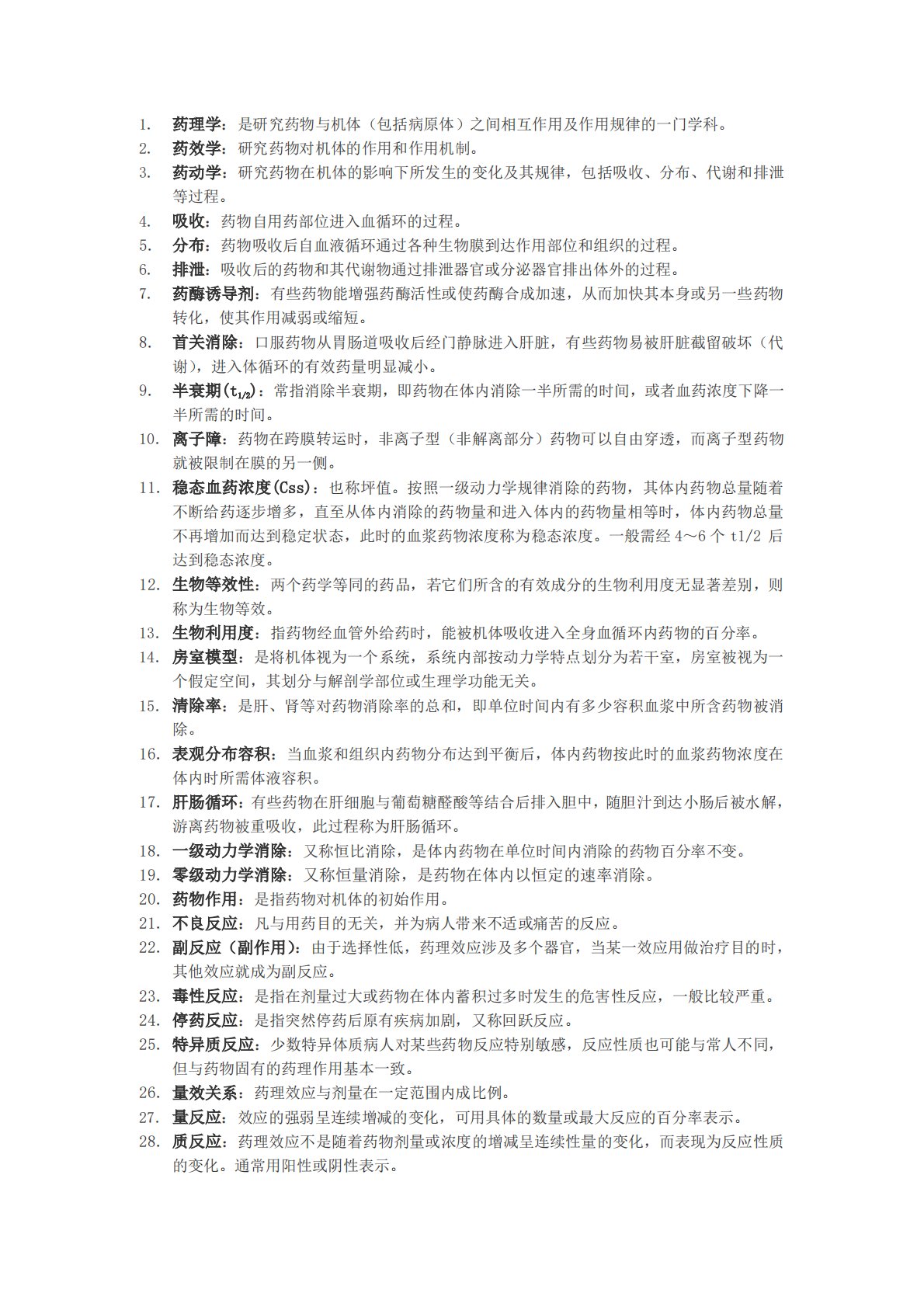 1.药理学:是研究药物与机体(包括病原体)之间相互作用及作用规律的一门学科。2.药效学:研究药物对机体的作用和作用机制。3.药动学:研究药物在机体的影响下所发生的变化及其规律,包括吸收、分布、代谢和排泄等过程。4.吸收:药物自用药部位进入血循环的过程。5.分布:药物吸收后自血液循环通过各种生物膜到达作用部位和组织的过程。6.排泄:吸收后的药物和其代谢物通过排泄器官或分泌器官排出体外的过程。7.药酶诱导剂:有些药物能增强药酶活性或使药酶合成加速,从而加快其本身或另一些药物转化,使其作用减弱或缩短。8.首关消除:口服药物从胃肠道吸收后经门静脉进入肝脏,有些药物易被肝脏截留破坏(代谢),进入体循环的...