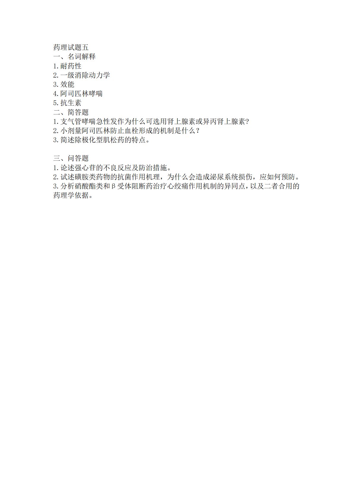 药理试题五一、名词解释1.耐药性2.一级消除动力学3.效能4.阿司匹林哮喘5.抗生素二、简答题1.支气管哮喘急性发作为什么可选用肾上腺素或异丙肾上腺素?2.小剂量阿司匹林防止血栓形成的机制是什么?3.简述除极化型肌松药的特点。三、问答题1.论述强心苷的不良反应及防治措施。2.试述磺胺类药物的抗菌作用机理,为什么会造成泌尿系统损伤,应如何预防。3.分析硝酸酯类和β受体阻断药治疗心绞痛作用机制的异同点,以及二者合用的药理学依据。一、名词解释1.耐药性:也称抗药性。指病原体及肿瘤细胞对化学治疗药物敏感性降低。2.一级消除动力学:体内药物在单位时间内消除的药物百分率不变,即单位时间内消除的药物量与血浆...