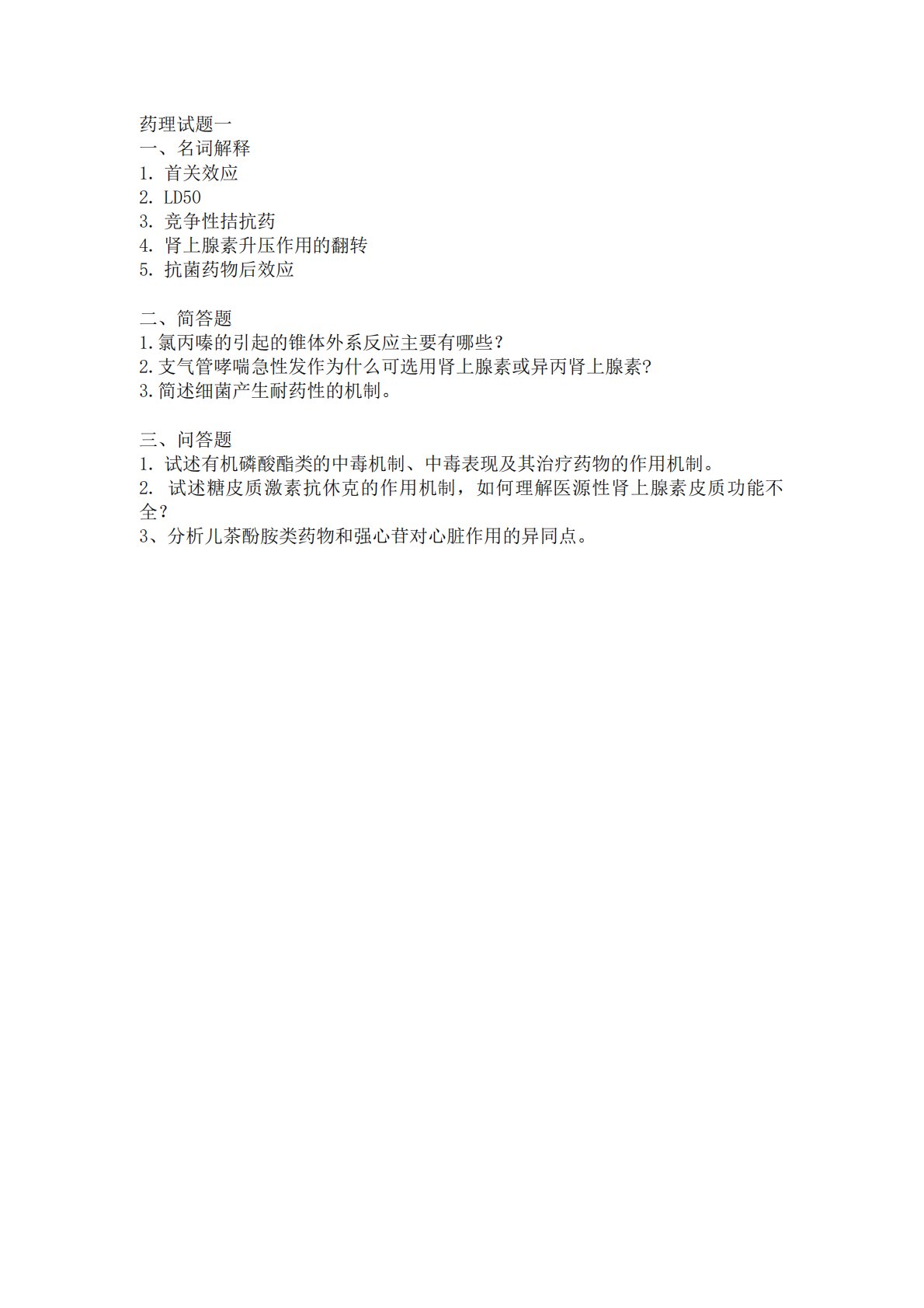 药理试题一一、名词解释1.首关效应2.LD503.竞争性拮抗药4.肾上腺素升压作用的翻转5.抗菌药物后效应二、简答题1.氯丙嗪的引起的锥体外系反应主要有哪些?2.支气管哮喘急性发作为什么可选用肾上腺素或异丙肾上腺素?3.简述细菌产生耐药性的机制。三、问答题1.试述有机磷酸酯类的中毒机制、中毒表现及其治疗药物的作用机制。2.试述糖皮质激素抗休克的作用机制,如何理解医源性肾上腺素皮质功能不全?3、分析儿茶酚胺类药物和强心苷对心脏作用的异同点。答案:一、名词解释1.首关效应:指胃肠道给药时,某些药物通过肠壁或肝脏时被其中的酶所代谢,使体循环药量明显减少的一种现象。2.LD50:引起50%动物发生死亡...