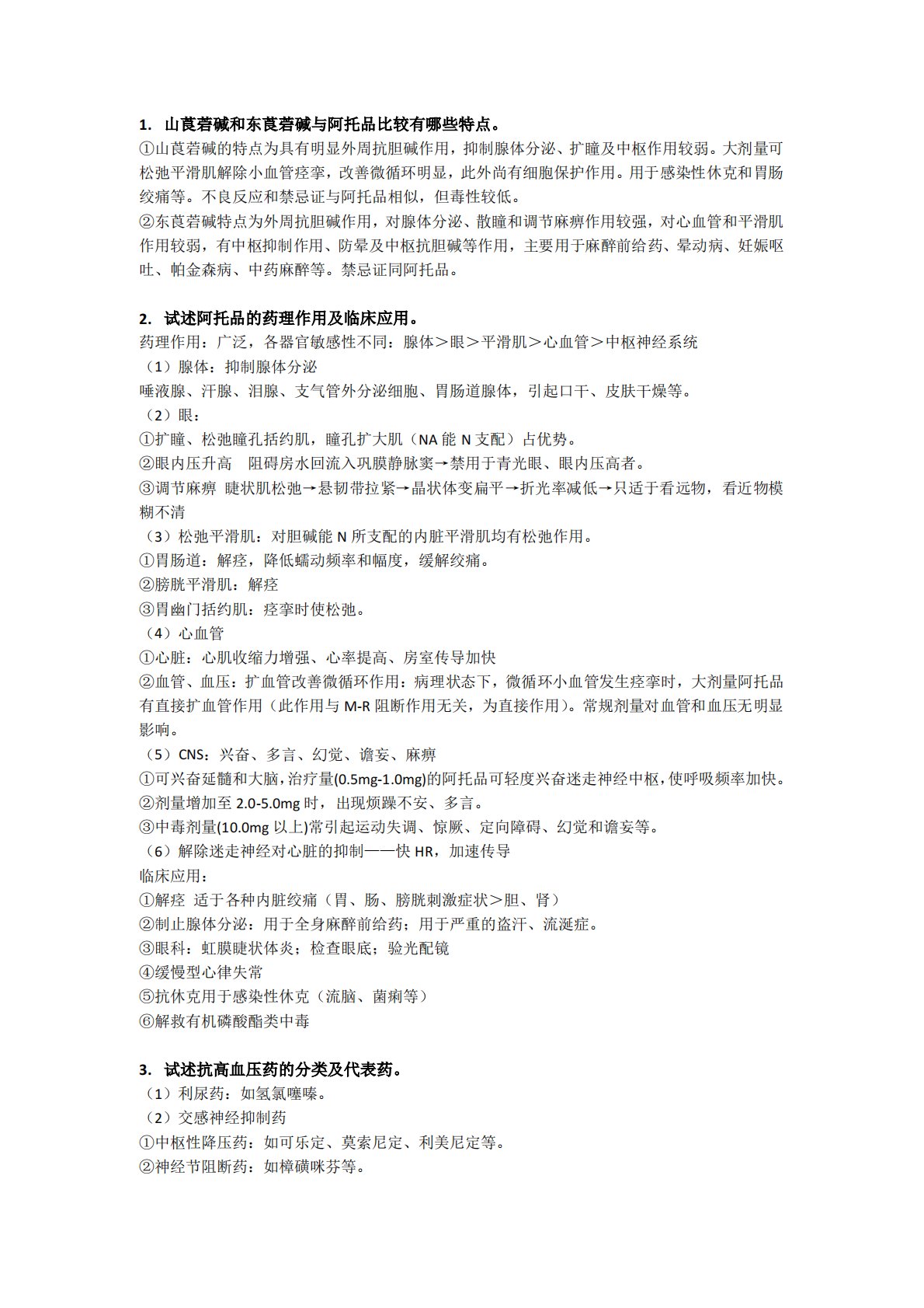 1.山莨菪碱和东莨菪碱与阿托品比较有哪些特点。①山莨菪碱的特点为具有明显外周抗胆碱作用,抑制腺体分泌、扩瞳及中枢作用较弱。大剂量可松弛平滑肌解除小血管痉挛,改善微循环明显,此外尚有细胞保护作用。用于感染性休克和胃肠绞痛等。不良反应和禁忌证与阿托品相似,但毒性较低。②东莨菪碱特点为外周抗胆碱作用,对腺体分泌、散瞳和调节麻痹作用较强,对心血管和平滑肌作用较弱,有中枢抑制作用、防晕及中枢抗胆碱等作用,主要用于麻醉前给药、晕动病、妊娠呕吐、帕金森病、中药麻醉等。禁忌证同阿托品。2.试述阿托品的药理作用及临床应用。药理作用:广泛,各器官敏感性不同:腺体>眼>平滑肌>心血管>中枢神经系统(1)腺体:抑制腺...