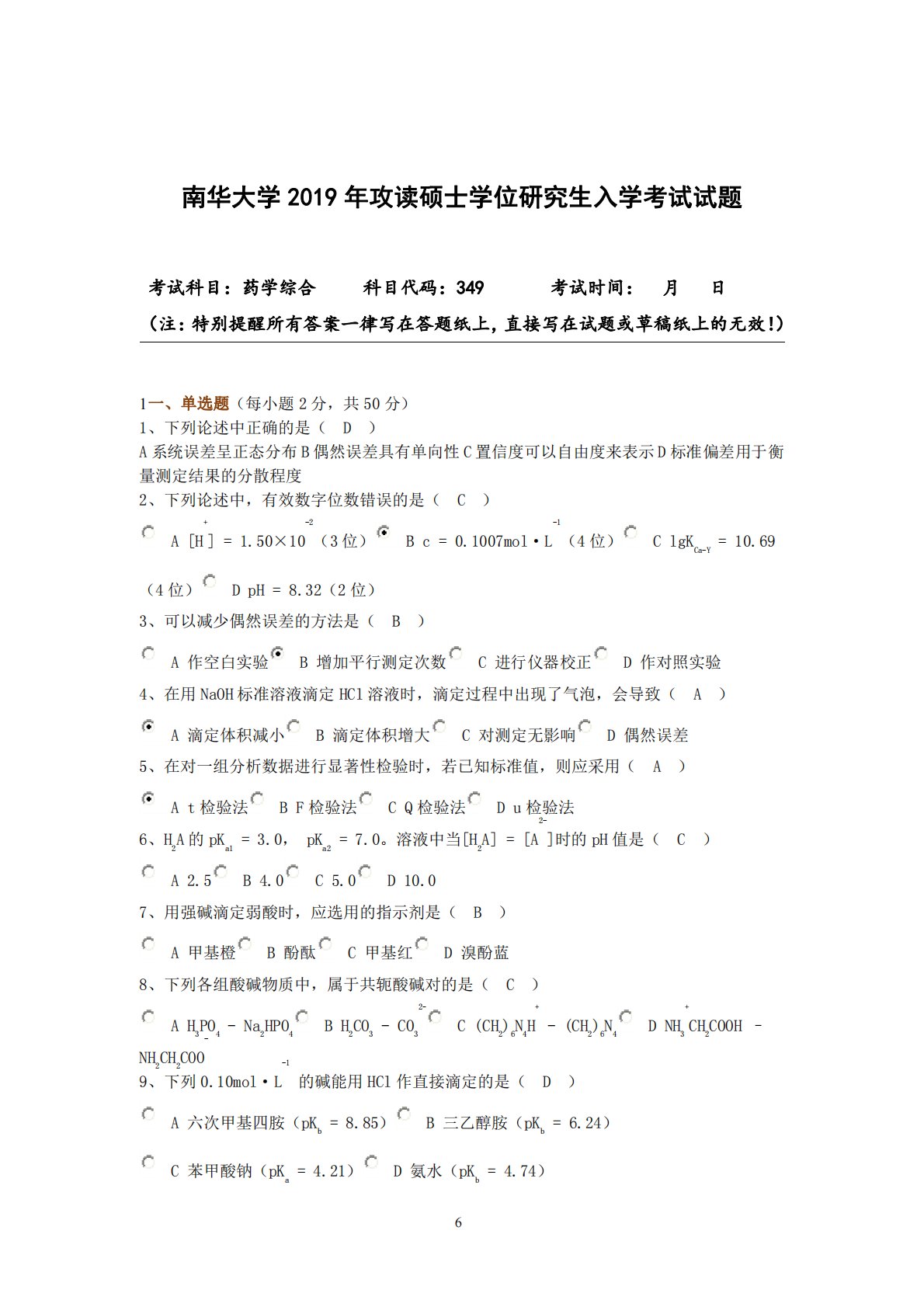 6南华大学201年攻读硕士学位研究生入学考试试题考试科目:药学综合科目代码:349考试时间:月日(注:特别提醒所有答案一律写在答题纸上,直接写在试题或草稿纸上的无效!)1一、单选题(每小题2分,共50分)1、下列论述中正确的是(D)A系统误差呈正态分布B偶然误差具有单向性C置信度可以自由度来表示D标准偏差用于衡量测定结果的分散程度2、下列论述中,有效数字位数错误的是(C)A[H+]=1.50×10-2(3位)Bc=0.1007mol·L-1(4位)ClgKCa-Y=10.69(4位)DpH=8.32(2位)3、可以减少偶然误差的方法是(B)A作空白实验B增加平行测定次数C进行仪器校正D作对照实...