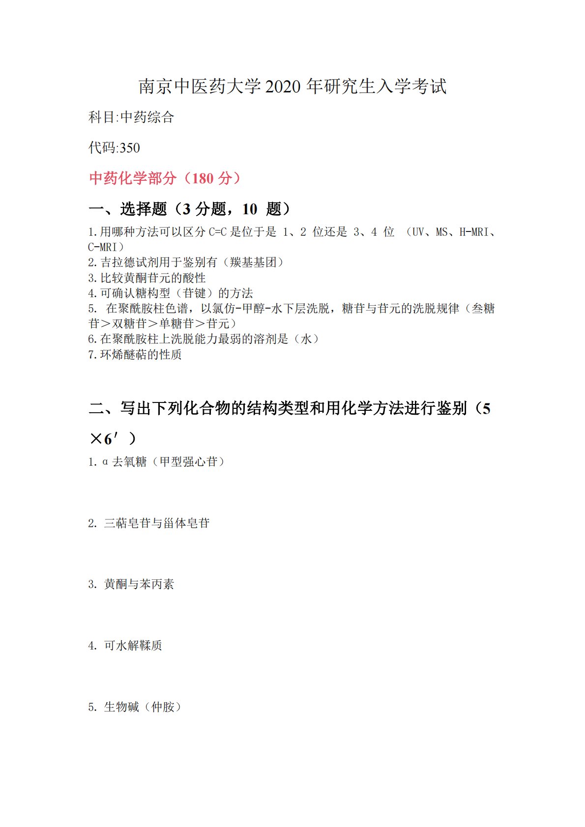 南京中医药大学2020年研究生入学考试科目:中药综合代码:350中药化学部分(180分)一、选择题(3分题,10题)1.用哪种方法可以区分C=C是位于是1、2位还是3、4位(UV、MS、H-MRI、C-MRI)2.吉拉德试剂用于鉴别有(羰基基团)3.比较黄酮苷元的酸性4.可确认糖构型(苷键)的方法5.在聚酰胺柱色谱,以氯仿-甲醇-水下层洗脱,糖苷与苷元的洗脱规律(叁糖苷>双糖苷>单糖苷>苷元)6.在聚酰胺柱上洗脱能力最弱的溶剂是(水)7.环烯醚萜的性质二、写出下列化合物的结构类型和用化学方法进行鉴别(5×6′)1.α去氧糖(甲型强心苷)2.三萜皂苷与甾体皂苷3.黄酮与苯丙素4.可水解鞣质5.生...