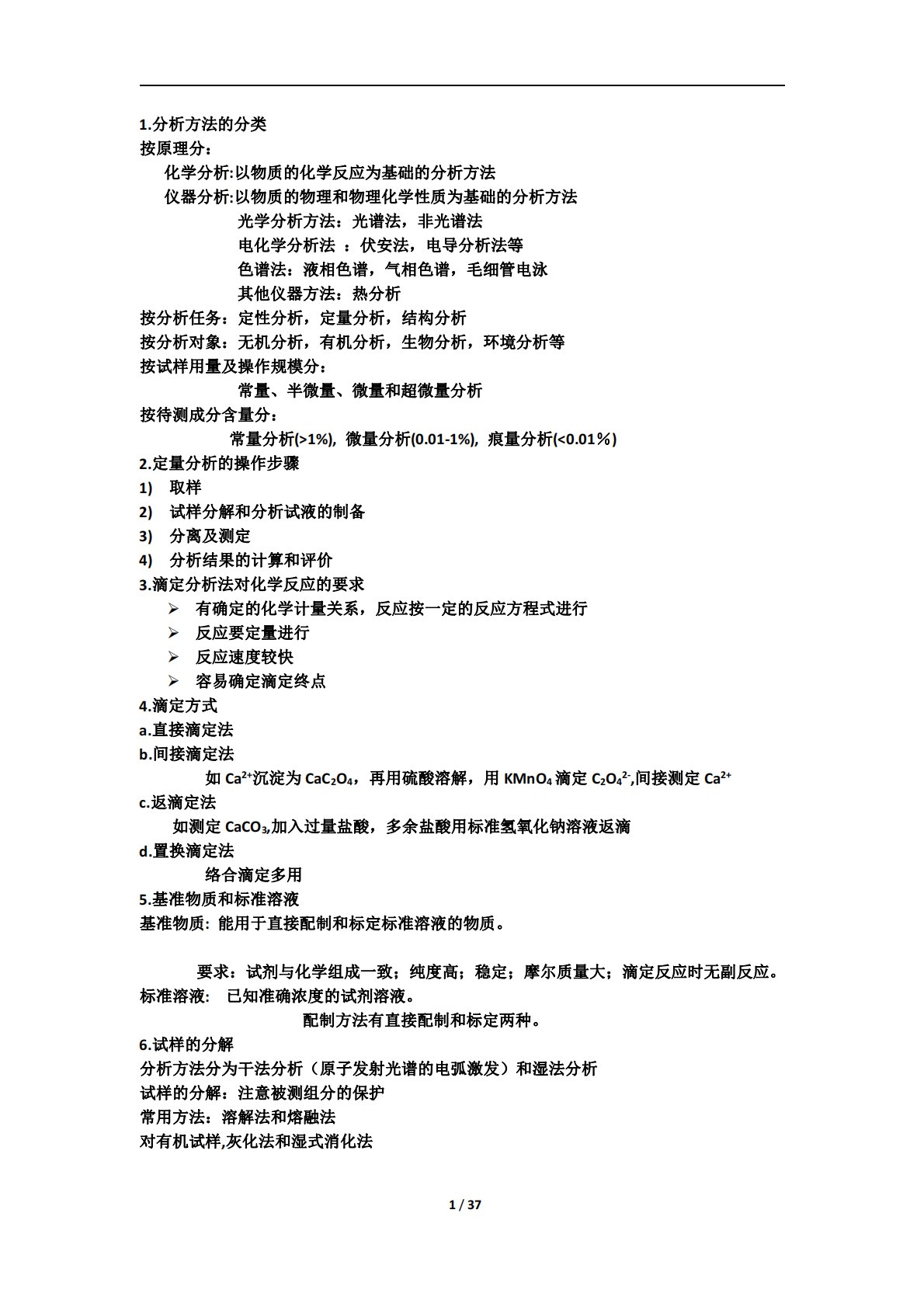 1/371.分析方法的分类按原理分:化学分析:以物质的化学反应为基础的分析方法仪器分析:以物质的物理和物理化学性质为基础的分析方法光学分析方法:光谱法,非光谱法电化学分析法:伏安法,电导分析法等色谱法:液相色谱,气相色谱,毛细管电泳其他仪器方法:热分析按分析任务:定性分析,定量分析,结构分析按分析对象:无机分析,有机分析,生物分析,环境分析等按试样用量及操作规模分:常量、半微量、微量和超微量分析按待测成分含量分:常量分析(>1%),微量分析(0.01-1%),痕量分析(