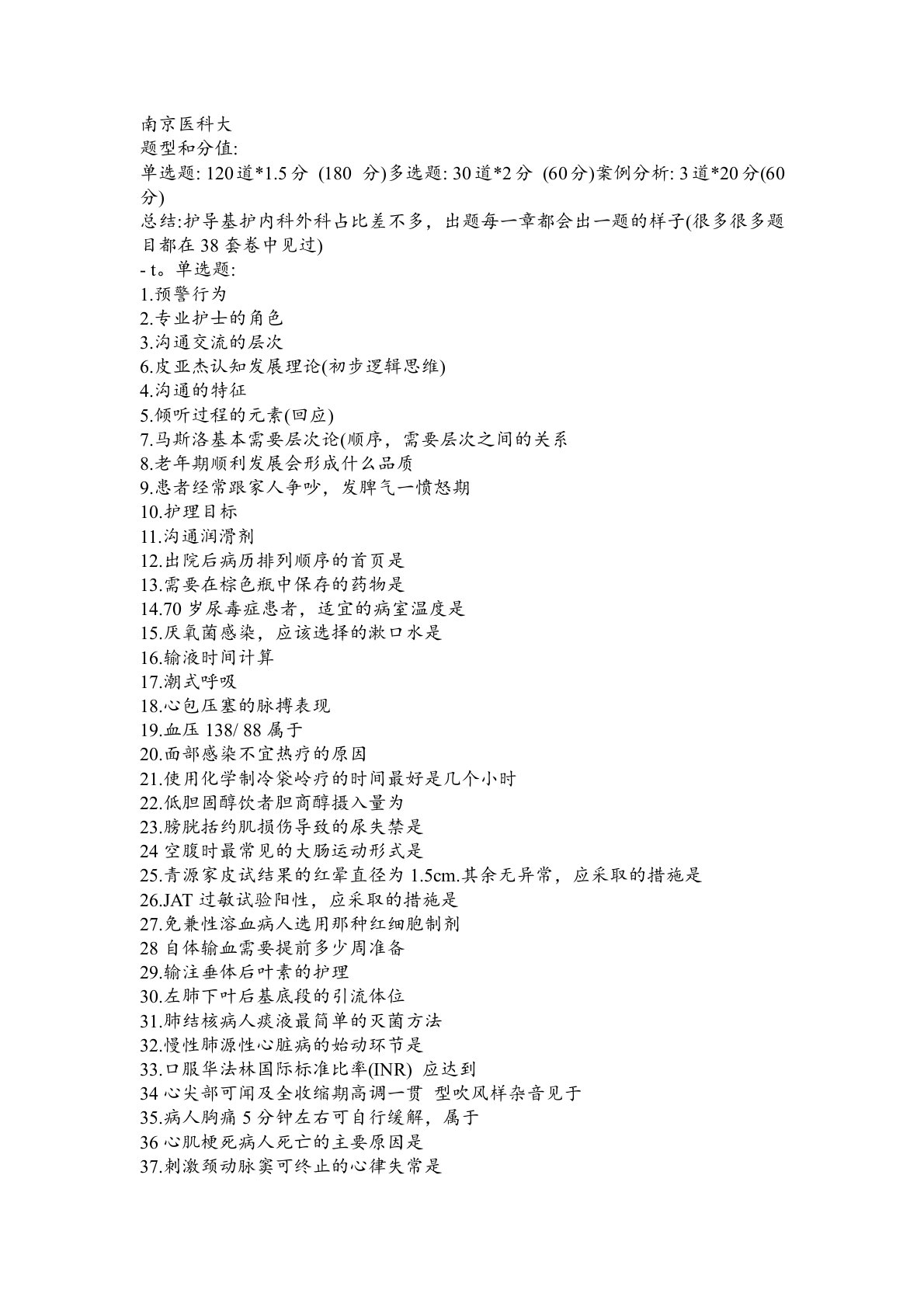 南京医科大题型和分值:单选题:120道*1.5分(180分)多选题:30道*2分(60分)案例分析:3道*20分(60分)总结:护导基护内科外科占比差不多,出题每一章都会出一题的样子(很多很多题目都在38套卷中见过)-t。单选题:1.预警行为2.专业护士的角色3.沟通交流的层次6.皮亚杰认知发展理论(初步逻辑思维)4.沟通的特征5.倾听过程的元素(回应)7.马斯洛基本需要层次论(顺序,需要层次之间的关系8.老年期顺利发展会形成什么品质9.患者经常跟家人争吵,发脾气一愤怒期10.护理目标11.沟通润滑剂12.出院后病历排列顺序的首页是13.需要在棕色瓶中保存的药物是14.70岁尿毒症患者,适宜的...