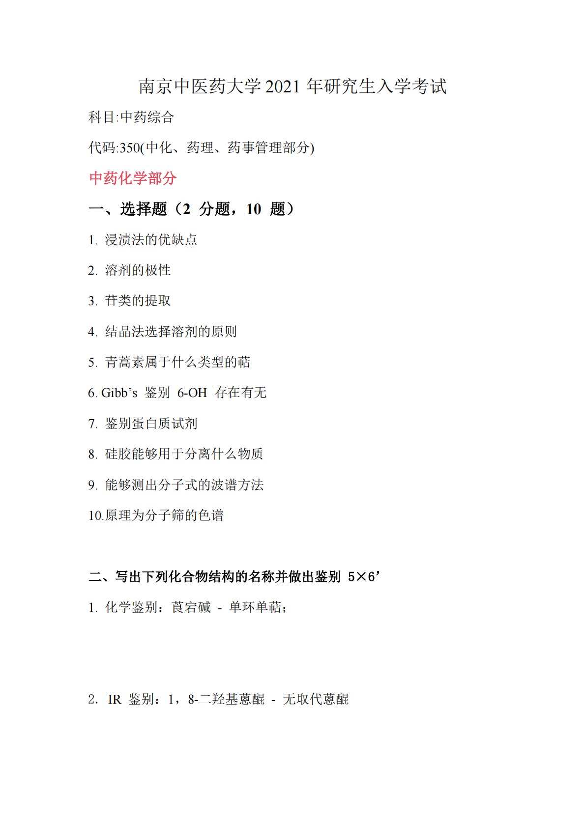 南京中医药大学2021年研究生入学考试科目:中药综合代码:350(中化、药理、药事管理部分)中药化学部分一、选择题(2分题,10题)1.浸渍法的优缺点2.溶剂的极性3.苷类的提取4.结晶法选择溶剂的原则5.青蒿素属于什么类型的萜6.Gibb’s鉴别6-OH存在有无7.鉴别蛋白质试剂8.硅胶能够用于分离什么物质9.能够测出分子式的波谱方法10.原理为分子筛的色谱二、写出下列化合物结构的名称并做出鉴别5×6’1.化学鉴别:莨宕碱-单环单萜;2.IR鉴别:1,8-二羟基蒽醌-无取代蒽醌3.UV鉴别:甲型强心苷-乙型强心苷4.化学鉴别:查尔酮-7,4’-二羟基黄酮5.NMR鉴别:β-D-葡糖糖苷-α-...
