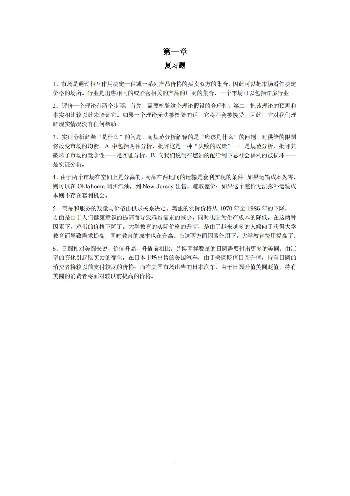 1第一章复习题1.市场是通过相互作用决定一种或一系列产品价格的买卖双方的集合,因此可以把市场看作决定价格的场所。行业是出售相同的或紧密相关的产品的厂商的集合,一个市场可以包括许多行业。2.评价一个理论有两个步骤:首先,需要检验这个理论假设的合理性;第二,把该理论的预测和事实相比较以此来验证它。如果一个理论无法被检验的话,它将不会被接受。因此,它对我们理解现实情况没有任何帮助。3.实证分析解释“是什么”的问题,而规范分析解释的是“应该是什么”的问题。对供给的限制将改变市场的均衡。A中包括两种分析,批评这是一种“失败的政策”——是规范分析,批评其破坏了市场的竞争性——是实证分析。B向我们说明在燃油...
