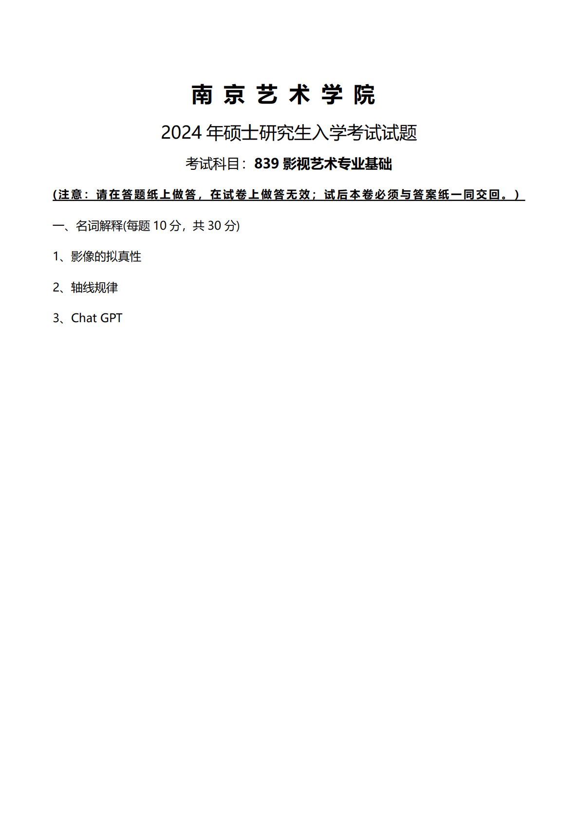 南京艺术学院839影视艺术专业基础(专硕)2024年真题