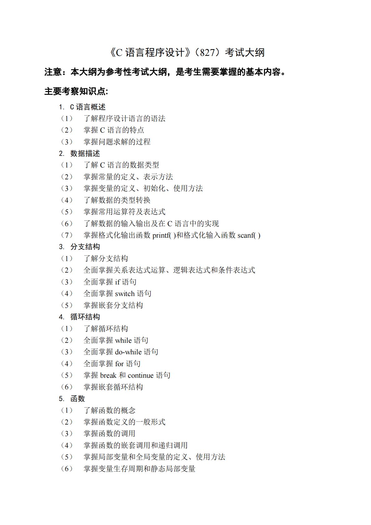 《C语言程序设计》(827)考试大纲注意:本大纲为参考性考试大纲,是考生需要掌握的基本内容。主要考察知识点:1.C语言概述(1)了解程序设计语言的语法(2)掌握C语言的特点(3)掌握问题求解的过程2.数据描述(1)了解C语言的数据类型(2)掌握常量的定义、表示方法(3)掌握变量的定义、初始化、使用方法(4)了解数据的类型转换(5)掌握常用运算符及表达式(6)了解数据的输入输出及在C语言中的实现(7)掌握格式化输出函数printf()和格式化输入函数scanf()3.分支结构(1)了解分支结构(2)全面掌握关系表达式运算、逻辑表达式和条件表达式(3)全面掌握if语句(4)全面掌握switch语句...