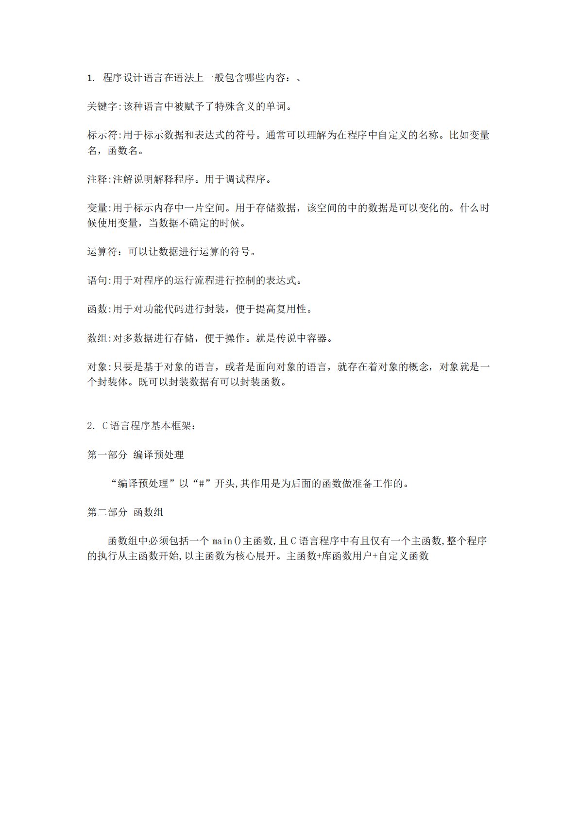 1.程序设计语言在语法上一般包含哪些内容:、关键字:该种语言中被赋予了特殊含义的单词。标示符:用于标示数据和表达式的符号。通常可以理解为在程序中自定义的名称。比如变量名,函数名。注释:注解说明解释程序。用于调试程序。变量:用于标示内存中一片空间。用于存储数据,该空间的中的数据是可以变化的。什么时候使用变量,当数据不确定的时候。运算符:可以让数据进行运算的符号。语句:用于对程序的运行流程进行控制的表达式。函数:用于对功能代码进行封装,便于提高复用性。数组:对多数据进行存储,便于操作。就是传说中容器。对象:只要是基于对象的语言,或者是面向对象的语言,就存在着对象的概念,对象就是一个封装体。既可以封...