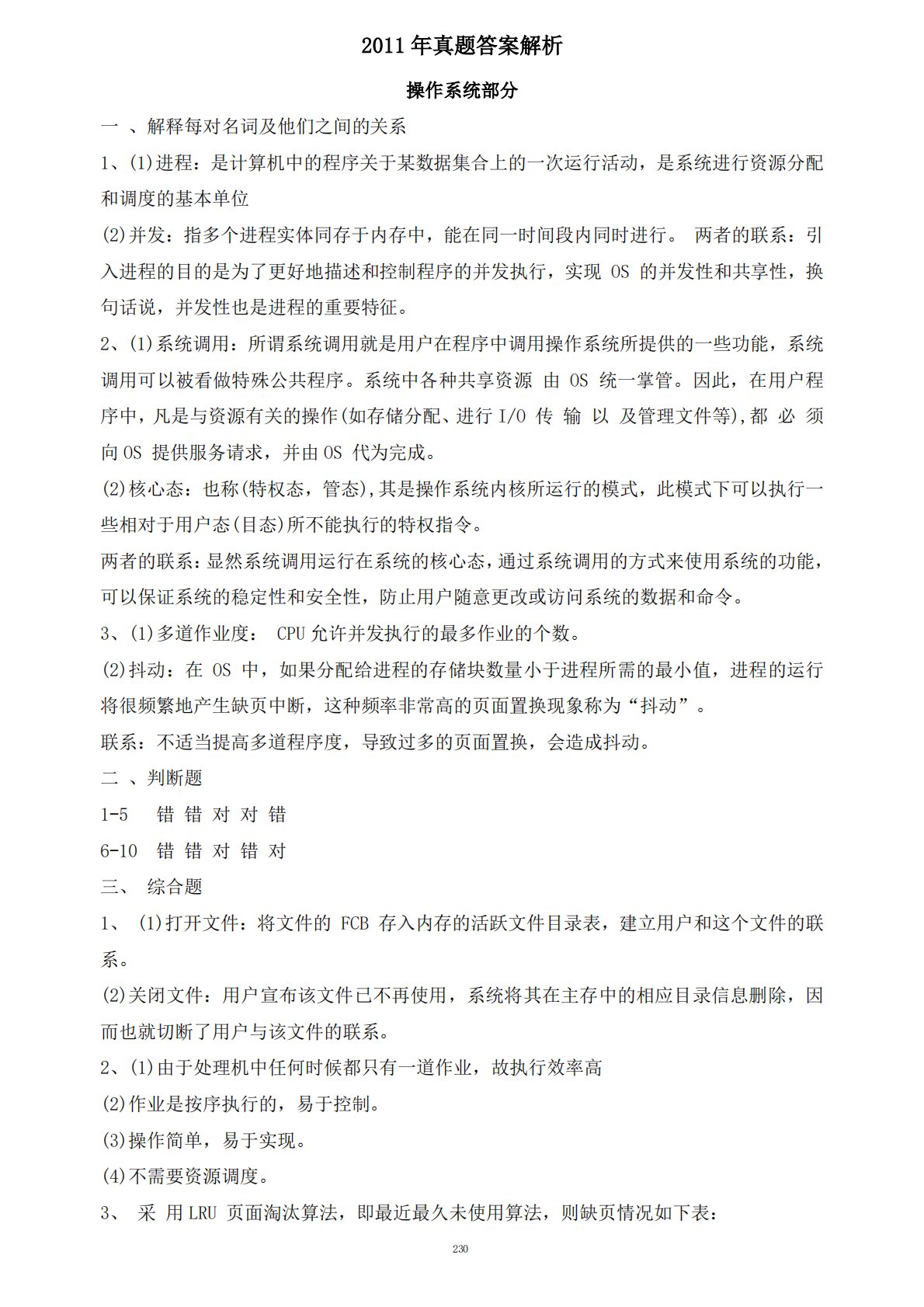 2302011年真题答案解析操作系统部分一、解释每对名词及他们之间的关系1、(1)进程:是计算机中的程序关于某数据集合上的一次运行活动,是系统进行资源分配和调度的基本单位(2)并发:指多个进程实体同存于内存中,能在同一时间段内同时进行。两者的联系:引入进程的目的是为了更好地描述和控制程序的并发执行,实现OS的并发性和共享性,换句话说,并发性也是进程的重要特征。2、(1)系统调用:所谓系统调用就是用户在程序中调用操作系统所提供的一些功能,系统调用可以被看做特殊公共程序。系统中各种共享资源由OS统一掌管。因此,在用户程序中,凡是与资源有关的操作(如存储分配、进行I/O传输以及管理文件等),都必须向...