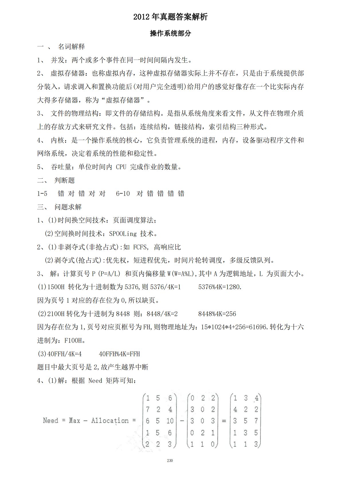2302012年真题答案解析操作系统部分一、名词解释1、并发:两个或多个事件在同一时间间隔内发生。2、虚拟存储器:也称虚拟内存,这种虚拟存储器实际上并不存在,只是由于系统提供部分装入,请求调入和置换功能后(对用户完全透明)给用户的感觉好像存在一个比实际内存大得多存储器,称为“虚拟存储器”。3、文件的物理结构:即文件的存储结构。是指从系统角度来看文件,从文件在物理介质上的存放方式来研究文件。包括:连续结构,链接结构,索引结构三种形式。4、内核:是一个操作系统的核心,它负责管理系统的进程,内存,设备驱动程序文件和网络系统,决定着系统的性能和稳定性。5、吞吐量:单位时间内CPU完成作业的数量。二、判...