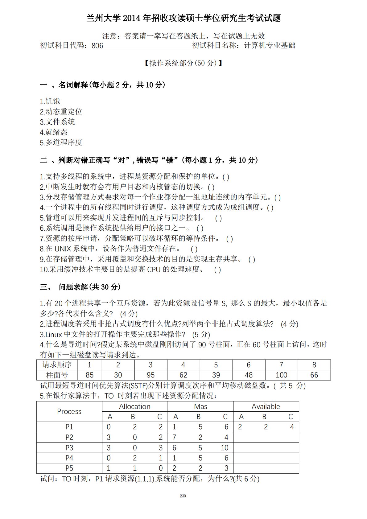 230兰州大学2014年招收攻读硕士学位研究生考试试题注意:答案请一率写在答题纸上,写在试题上无效初试科目代码:806初试科目名称:计算机专业基础【操作系统部分(50分)】一、名词解释(每小题2分,共10分)1.饥饿2.动态重定位3.文件系统4.就绪态5.多道程序度二、判断对错正确写“对”,错误写“错”(每小题1分,共10分)1.支持多线程的系统中,进程是资源分配和保护的单位。()2.中断发生时就有会有用户目态和内核管态的切换。()3.分段存储管理方式要求对每一个作业都分配一组地址连续的内存单元。()4.一个进程中的所有线程同时进行调度,这种调度方式成为成组调度。()5.管道可以用来实现并发进...