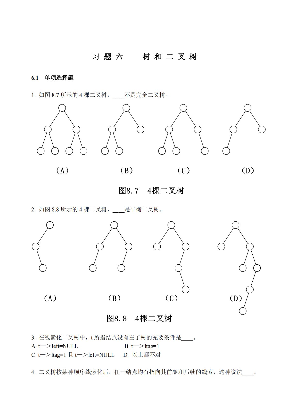 习题六树和二叉树6.1单项选择题1.如图8.7所示的4棵二叉树,____不是完全二叉树。2.如图8.8所示的4棵二叉树,____是平衡二叉树。3.在线索化二叉树中,t所指结点没有左子树的充要条件是____。A.t—>left=NULLB.t—>ltag=1C.t—>ltag=1且t—>left=NULLD.以上都不对4.二叉树按某种顺序线索化后,任一结点均有指向其前驱和后续的线索,这种说法____。A.正确B.错误5.二叉树的前序遍历序列中,任意一个结点均处在其子女结点的前面,这种说法____。A.正确B.错误6.由于二叉树中每个结点的度最大为2,所以二叉树是一种特殊的树,这种说法____。A...