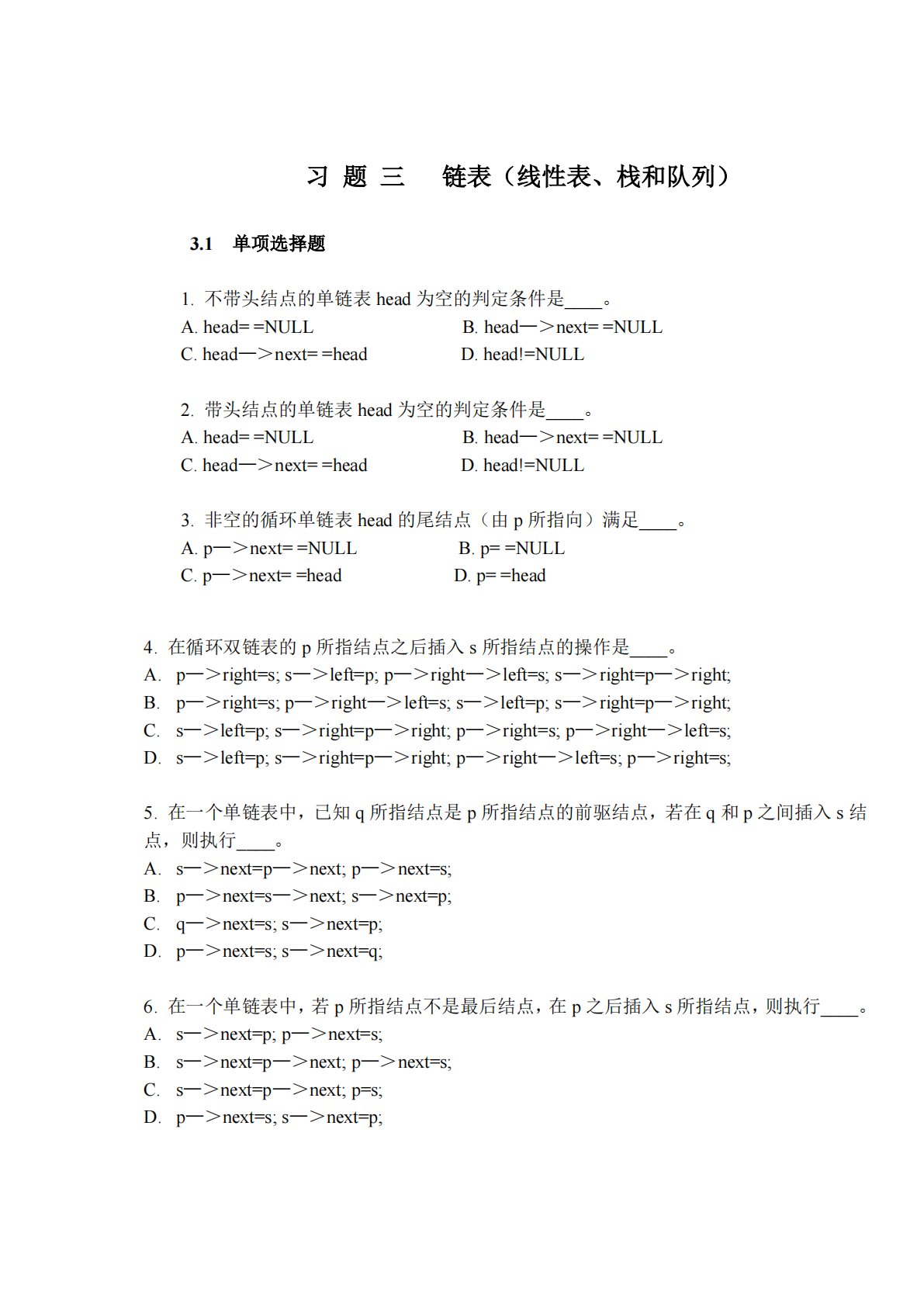 习题三链表(线性表、栈和队列)3.1单项选择题1.不带头结点的单链表head为空的判定条件是____。A.head==NULLC.head—>next==headB.head—>next==NULLD.head!=NULL2.带头结点的单链表head为空的判定条件是____。A.head==NULLC.head—>next==headB.head—>next==NULLD.head!=NULL3.非空的循环单链表head的尾结点(由p所指向)满足____。A.p—>next==NULLC.p—>next==headB.p==NULLD.p==head6.在一个单链表中,若p所指结点不是最后结点...
