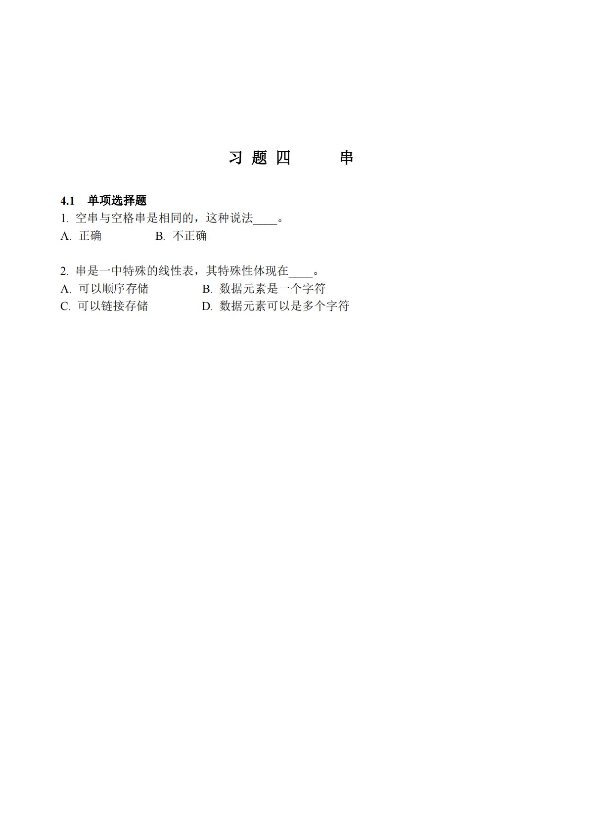 习题四串4.1单项选择题1.空串与空格串是相同的,这种说法____。A.正确B.不正确2.串是一中特殊的线性表,其特殊性体现在____。A.可以顺序存储C.可以链接存储B.数据元素是一个字符D.数据元素可以是多个字符习题四串4.1单项选择题1.空串与空格串是相同的,这种说法____。A.正确B.不正确2.串是一中特殊的线性表,其特殊性体现在____。A.可以顺序存储C.可以链接存储B.数据元素是一个字符D.数据元素可以是多个字符3.设有两个串p和q,求q在p中首次出现的位置的运算称作____。A.连接C.求子串B.模式匹配D.求串长4.设串s1=’ABCDEFG’,s2=’PQRST’,函数c...