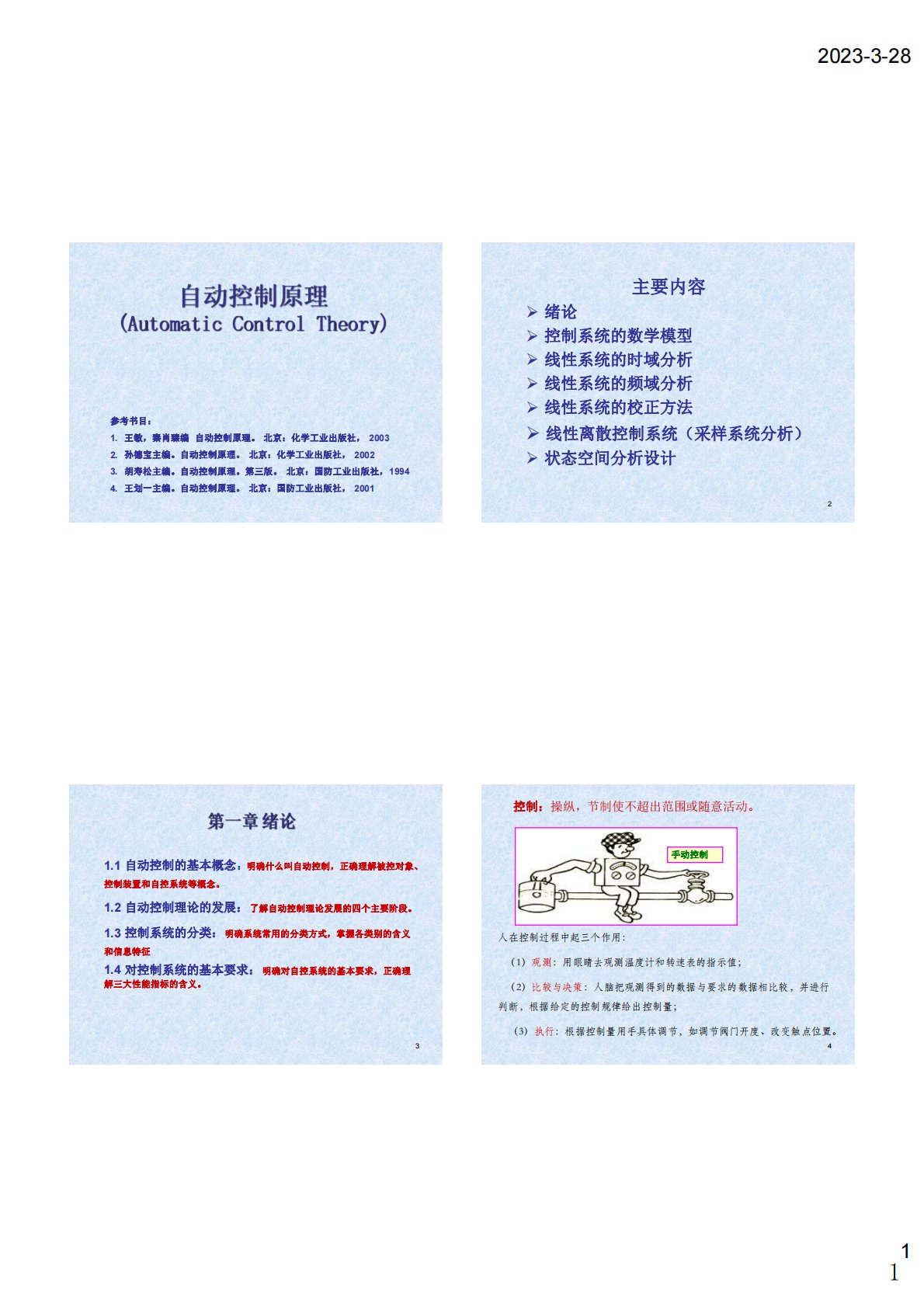 2023-3-281参考书目:1.王敏,秦肖臻编自动控制原理。北京:化学工业出版社,20032.孙德宝主编。自动控制原理。北京:化学工业出版社,20023.胡寿松主编。自动控制原理。第三版。北京:国防工业出版社,19944.王划一主编。自动控制原理。北京:国防工业出版社,20012主要内容Ø绪论Ø控制系统的数学模型Ø线性系统的时域分析Ø线性系统的频域分析Ø线性系统的校正方法Ø线性离散控制系统(采样系统分析)Ø状态空间分析设计31.1自动控制的基本概念:明确什么叫自动控制,正确理解被控对象、控制装置和自控系统等概念。1.2自动控制理论的发展:了解自动控制理论发展的四个主要阶段。1.3控制系统的分...