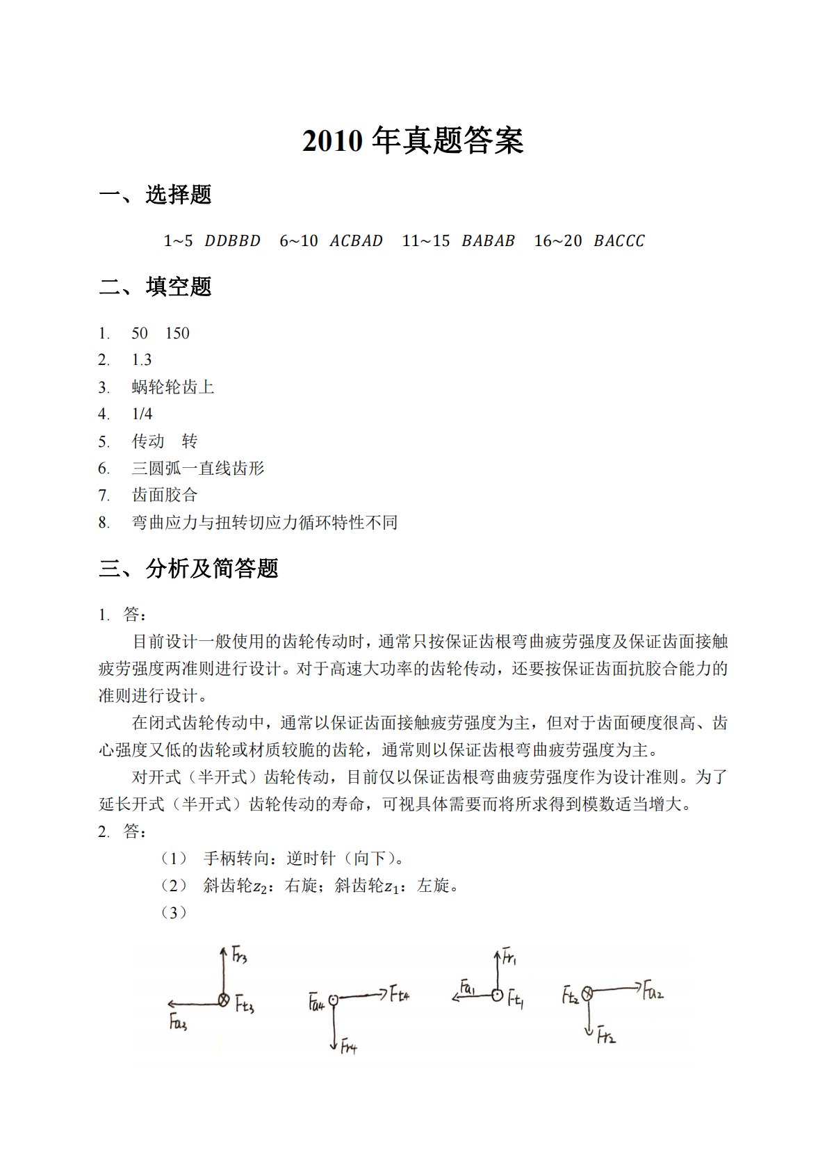 2010年真题答案一、选择题1~56~1011~1516~20二、填空题1.501502.1.33.蜗轮轮齿上4.1/45.传动转6.三圆弧一直线齿形7.齿面胶合8.弯曲应力与扭转切应力循环特性不同三、分析及简答题1.答:目前设计一般使用的齿轮传动时,通常只按保证齿根弯曲疲劳强度及保证齿面接触疲劳强度两准则进行设计。对于高速大功率的齿轮传动,还要按保证齿面抗胶合能力的准则进行设计。在闭式齿轮传动中,通常以保证齿面接触疲劳强度为主,但对于齿面硬度很高、齿心强度又低的齿轮或材质较脆的齿轮,通常则以保证齿根弯曲疲劳强度为主。对开式(半开式)齿轮传动,目前仅以保...