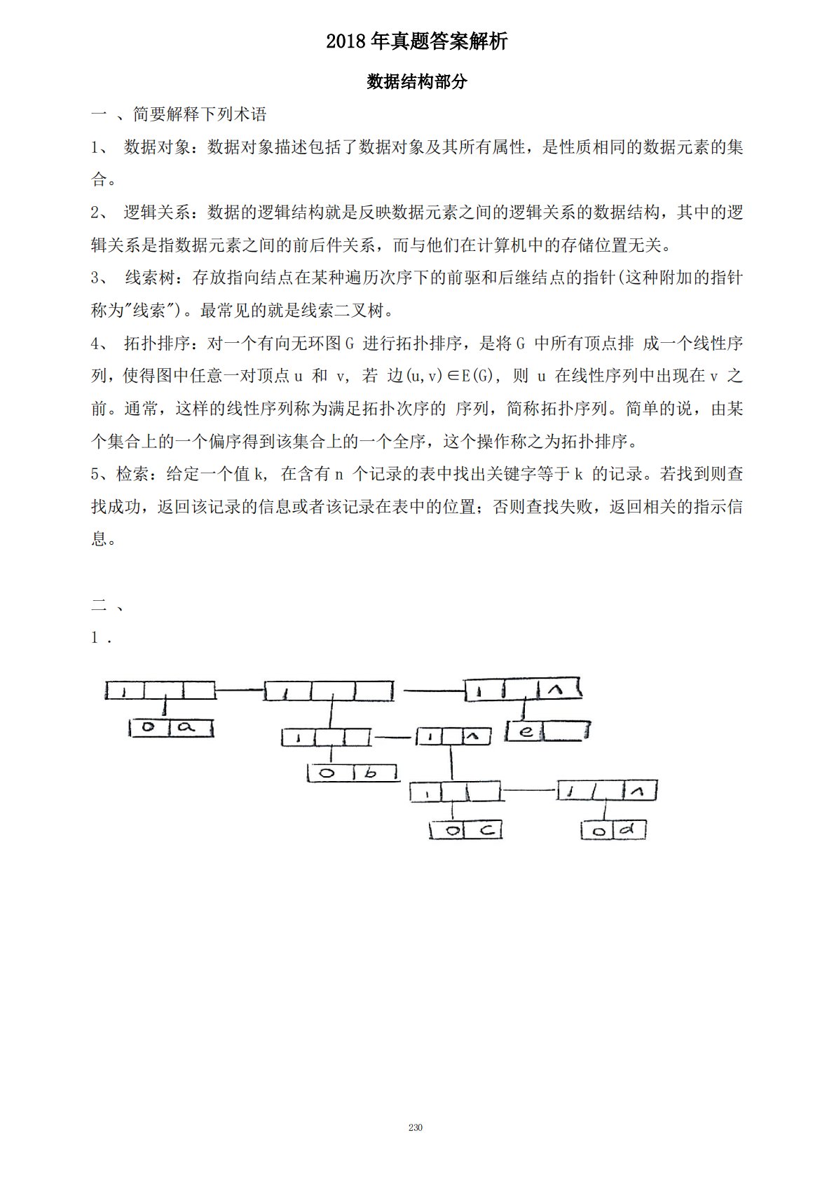 2302018年真题答案解析数据结构部分一、简要解释下列术语1、数据对象:数据对象描述包括了数据对象及其所有属性,是性质相同的数据元素的集合。2、逻辑关系:数据的逻辑结构就是反映数据元素之间的逻辑关系的数据结构,其中的逻辑关系是指数据元素之间的前后件关系,而与他们在计算机中的存储位置无关。3、线索树:存放指向结点在某种遍历次序下的前驱和后继结点的指针(这种附加的指针称为"线索")。最常见的就是线索二叉树。4、拓扑排序:对一个有向无环图G进行拓扑排序,是将G中所有顶点排成一个线性序列,使得图中任意一对顶点u和v,若边(u,v)∈E(G),则u在线性序列中出现在v之前。通常,这样的线性序列称为满足...