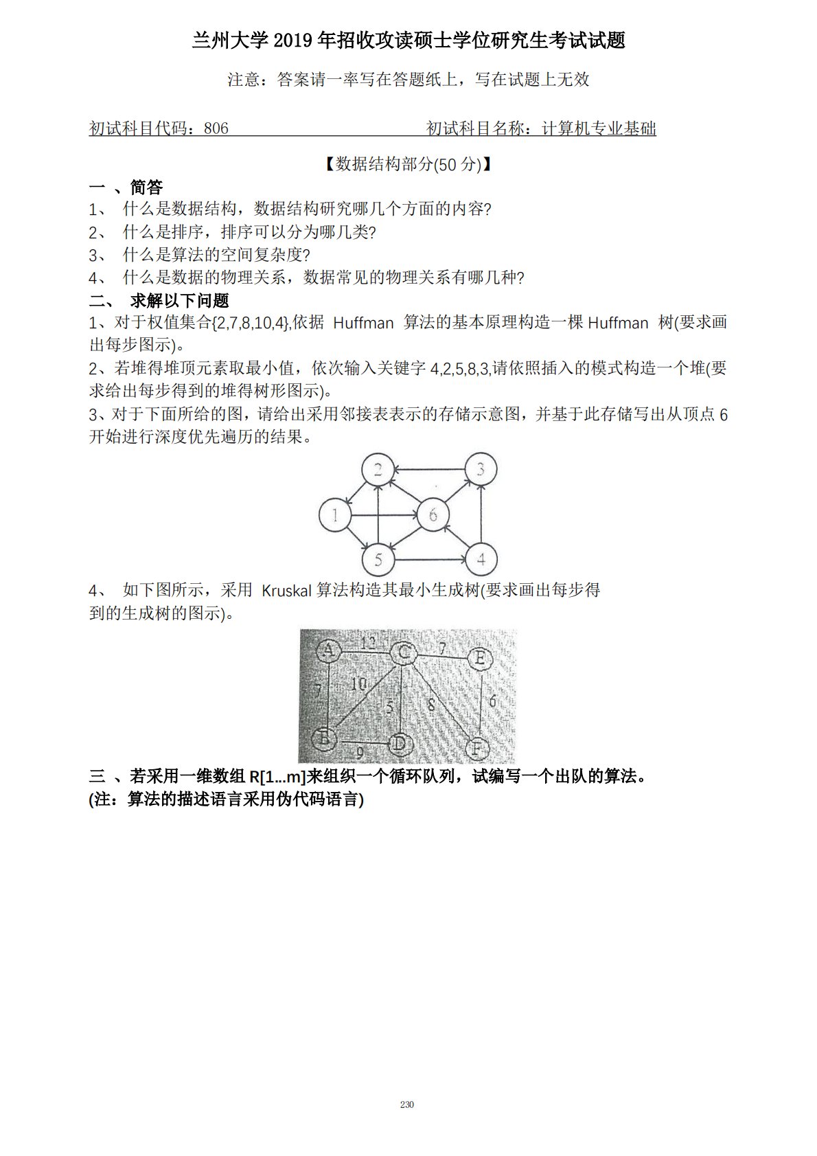兰州大学806计算机专业2019年真题