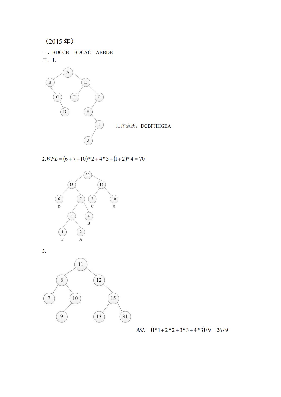 (2015年)一、BDCCBBDCACABBDB二、1.后序遍历:DCBFJIHGEA2.704*213*42*1076WPL3.9/269/3*43*32*21*1ASL4.un(3)=un(2)+8=27;un(2)=un(1)+8=19;un(1)=un(0)+8=11;un(0)=3.5.(1)(5,5);(2)输出元素e6.生成边次序:FEEBEHHDDCCAAG7.11/1413111121111成功ASL散列地址0123456789101112131415关键字4818195220231027121114比较次数11...