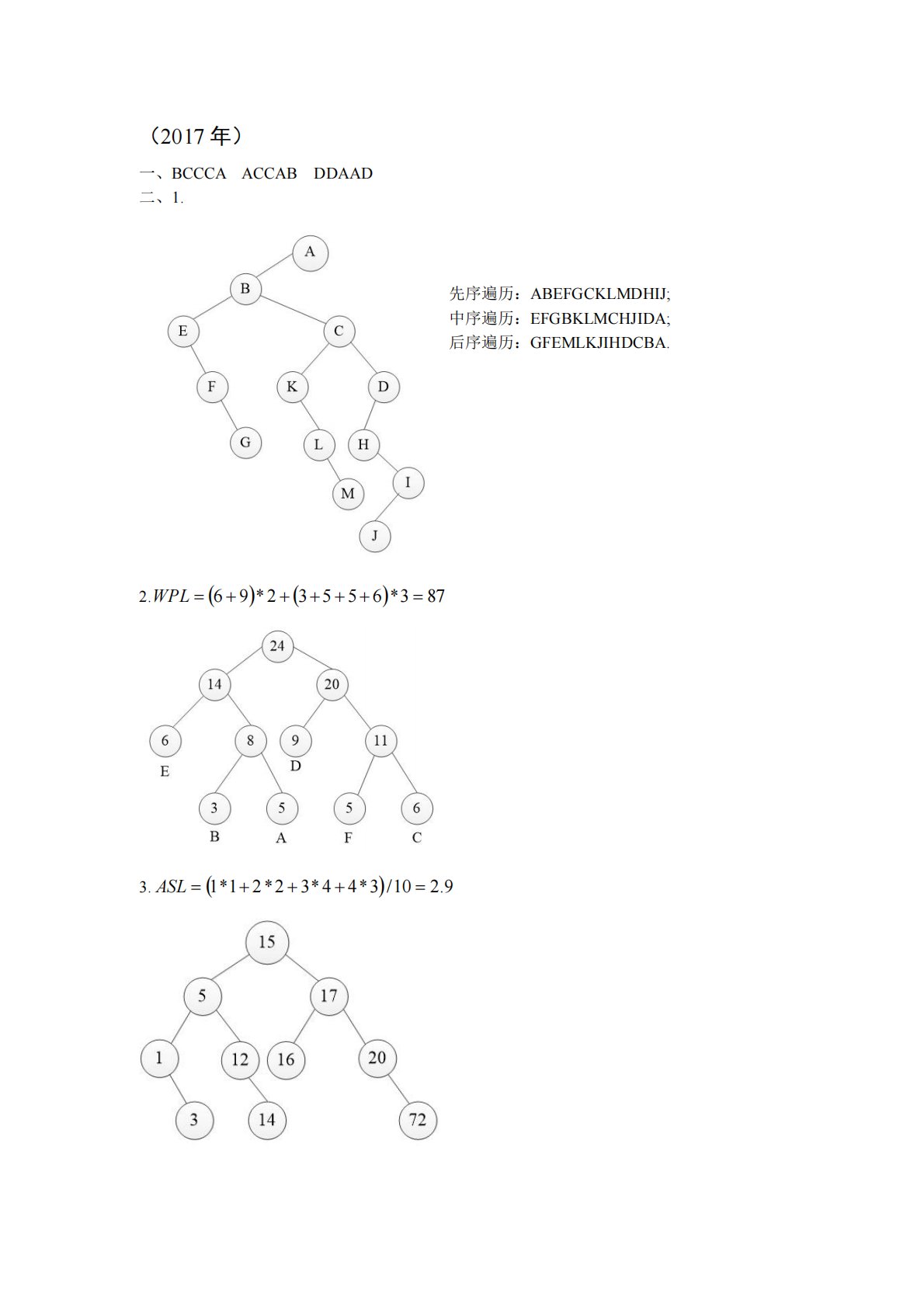 (2017年)一、BCCCAACCABDDAAD二、1.先序遍历:ABEFGCKLMDHIJ;中序遍历:EFGBKLMCHJIDA;后序遍历:GFEMLKJIHDCBA.2.873*65532*96WPL3.9.210/3*44*32*21*1ASL4.un(5)=un(4)+un(3)=18+11=29;un(4)=un(3)+un(2)=11+7=18;un(3)=un(2)+un(1)=7+4=11;un(2)=un(1)+un(0)=4+3=7;un(1)=4;un(0)=3.5.(1)9,4,5,6;(1)demo函数的功能:从栈顶取出元素,值...