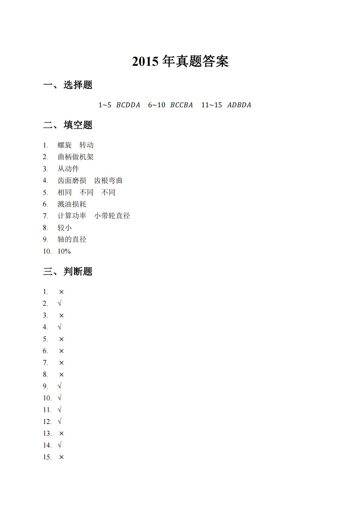 2015年真题答案一、选择题1~56~1011~15二、填空题1.螺旋转动2.曲柄做机架3.从动件4.齿面磨损齿根弯曲5.相同不同不同6.溅油损耗7.计算功率小带轮直径8.较小9.轴的直径10.10%三、判断题1.×2.√3.×4.√5.×6.×7.×8.×9.√10.√11.√12.√13.×14.√15.×四、分析题答:(1)蜗杆旋向:右旋;转动方向:向右(2)五、分析题答:(1)偏置直动尖顶推杆盘形凸轮机构作直线AO交理论轮廓线为B、E两点,以最小向径OB为半径,O为圆心作圆,该圆就是基圆。然后以O为圆心作与推杆导路中心轴相切的圆,则得偏距圆。(2)作直线O...