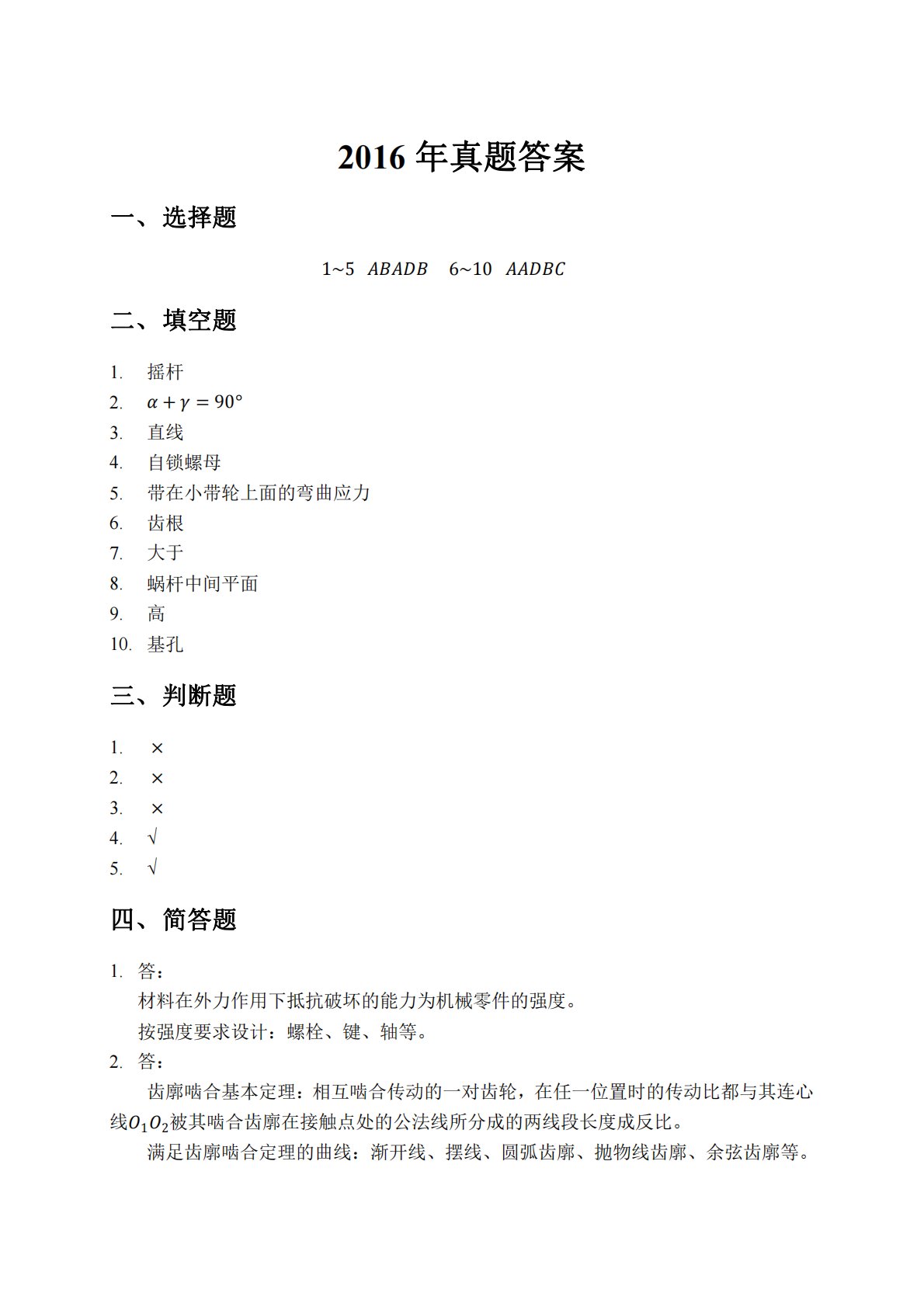 2016年真题答案一、选择题1~56~10二、填空题1.摇杆2.+=90°3.直线4.自锁螺母5.带在小带轮上面的弯曲应力6.齿根7.大于8.蜗杆中间平面9.高10.基孔三、判断题1.×2.×3.×4.√5.√四、简答题1.答:材料在外力作用下抵抗破坏的能力为机械零件的强度。按强度要求设计:螺栓、键、轴等。2.答:齿廓啮合基本定理:相互啮合传动的一对齿轮,在任一位置时的传动比都与其连心线12被其啮合齿廓在接触点处的公法线所分成的两线段长度成反比。满足齿廓啮合定理的曲线:渐开线、摆线、圆弧齿廓、抛物线齿廓、余弦齿廓等。3.答:轴向定位:轴肩、套筒、轴端挡圈、轴承端盖、...