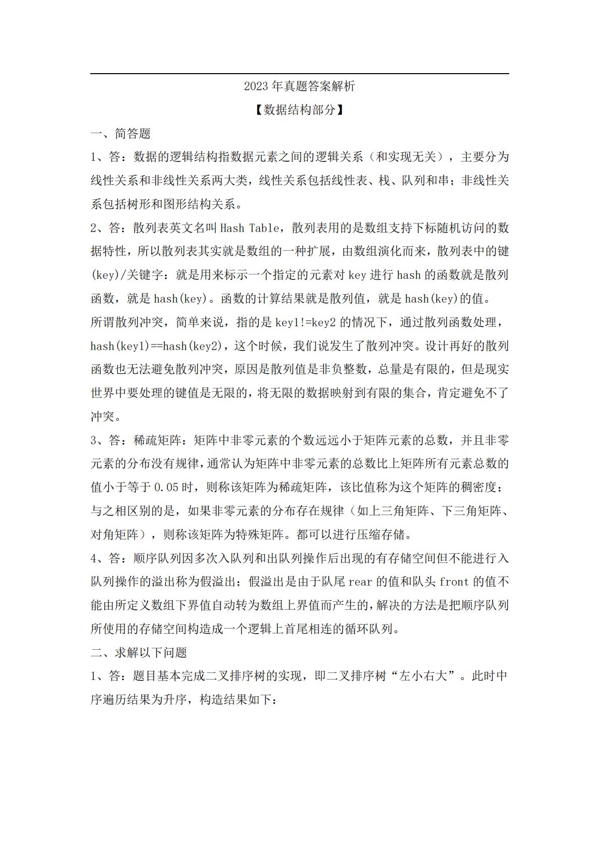 2023年真题答案解析【数据结构部分】一、简答题1、答:数据的逻辑结构指数据元素之间的逻辑关系(和实现无关),主要分为线性关系和非线性关系两大类,线性关系包括线性表、栈、队列和串;非线性关系包括树形和图形结构关系。2、答:散列表英文名叫HashTable,散列表用的是数组支持下标随机访问的数据特性,所以散列表其实就是数组的一种扩展,由数组演化而来,散列表中的键(key)/关键字:就是用来标示一个指定的元素对key进行hash的函数就是散列函数,就是hash(key)。函数的计算结果就是散列值,就是hash(key)的值。所谓散列冲突,简单来说,指的是key1!=key2的情况下,通过散列函数处...