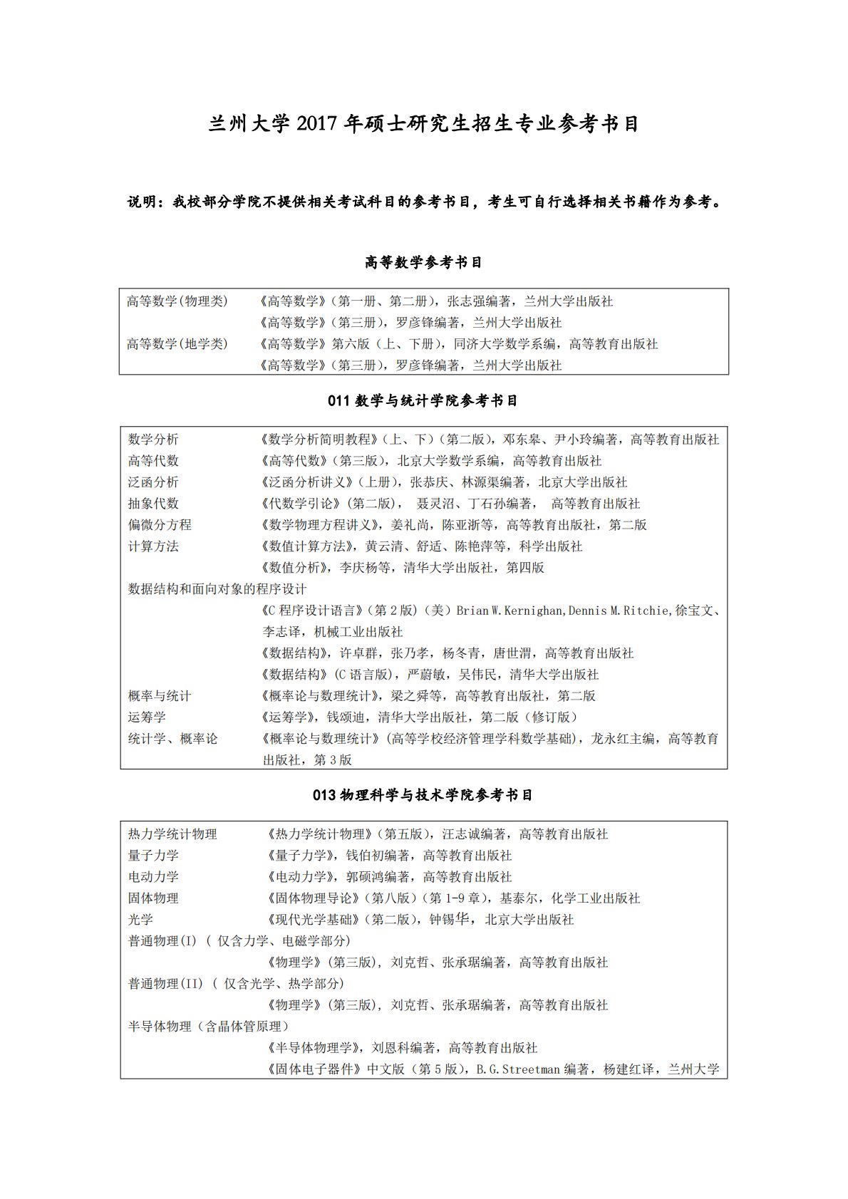 兰州大学2017年硕士研究生招生专业参考书目说明:我校部分学院不提供相关考试科目的参考书目,考生可自行选择相关书籍作为参考。高等数学参考书目高等数学(物理类)《高等数学》(第一册、第二册),张志强编著,兰州大学出版社《高等数学》(第三册),罗彦锋编著,兰州大学出版社高等数学(地学类)《高等数学》第六版(上、下册),同济大学数学系编,高等教育出版社《高等数学》(第三册),罗彦锋编著,兰州大学出版社011数学与统计学院参考书目数学分析《数学分析简明教程》(上、下)(第二版),邓东皋、尹小玲编著,高等教育出版社高等代数《高等代数》(第三版),北京大学数学系编,高等教育出版社泛函分析《泛函分析讲义》(...