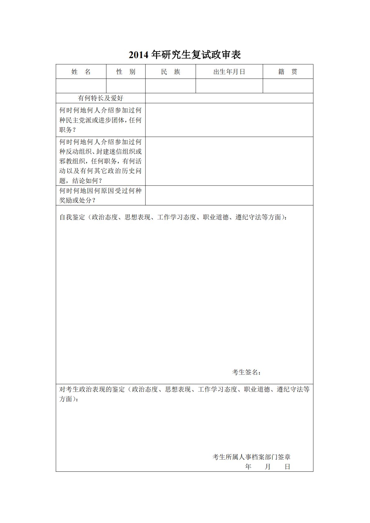 2014年研究生复试政审表姓名性别民族出生年月日籍贯有何特长及爱好何时何地何人介绍参加过何种民主党派或进步团体,任何职务?何时何地何人介绍参加过何种反动组织、封建迷信组织或邪教组织,任何职务,有何活动以及有何其它政治历史问题,结论如何?何时何地因何原因受过何种奖励或处分?自我鉴定(政治态度、思想表现、工作学习态度、职业道德、遵纪守法等方面):考生签名:对考生政治表现的鉴定(政治态度、思想表现、工作学习态度、职业道德、遵纪守法等方面):考生所属人事档案部门签章年月日百校文库—海量高校资料共享库百校文库是一个线上大学生专业学习资料共享平台,致力于通过用户自主上传与分享,打造一个涵盖各大高校、各学科...