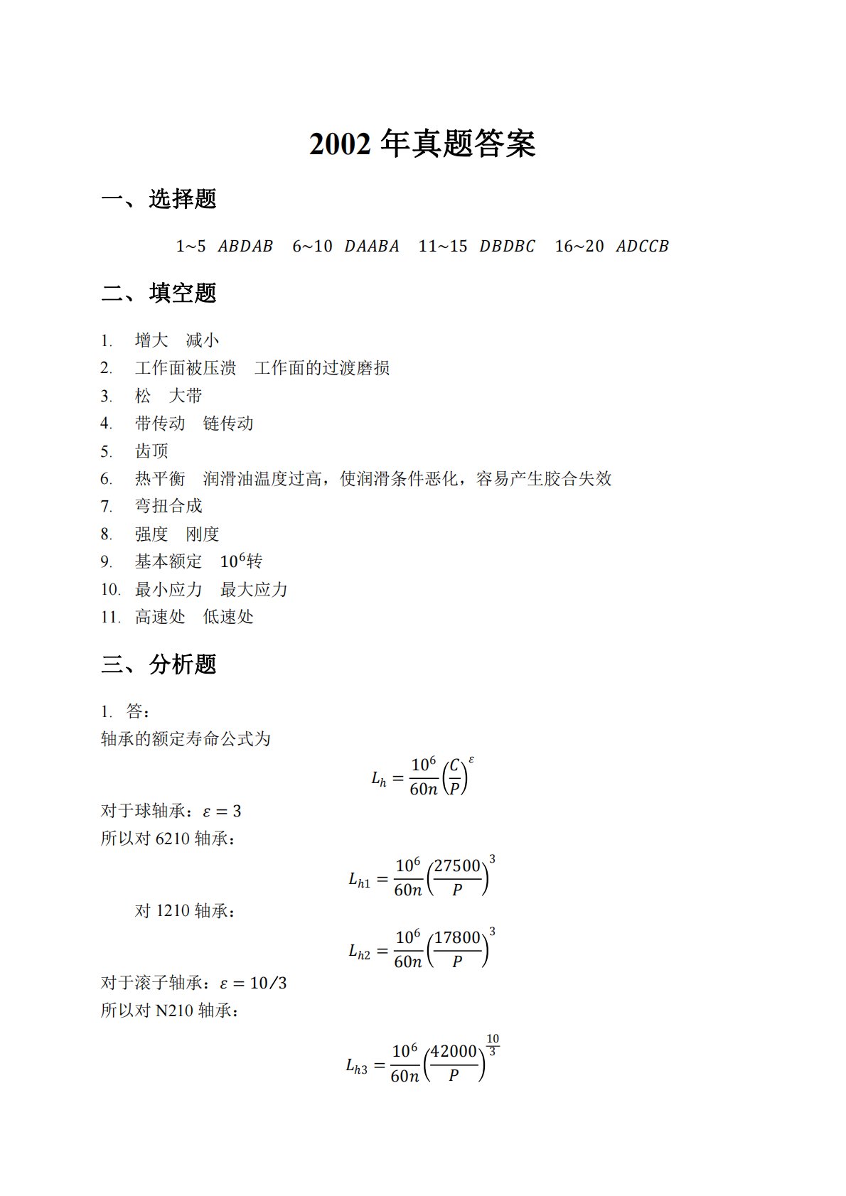 2002年真题答案一、选择题1~56~1011~1516~20二、填空题1.增大减小2.工作面被压溃工作面的过渡磨损3.松大带4.带传动链传动5.齿顶6.热平衡润滑油温度过高,使润滑条件恶化,容易产生胶合失效7.弯扭合成8.强度刚度9.基本额定106转10.最小应力最大应力11.高速处低速处三、分析题1.答:轴承的额定寿命公式为ℎ=10660对于球轴承:=3所以对6210轴承:ℎ1=10660275003对1210轴承:ℎ2=10660178003对于滚子轴承:=103所以对N210轴承:ℎ3=1066042000103所...