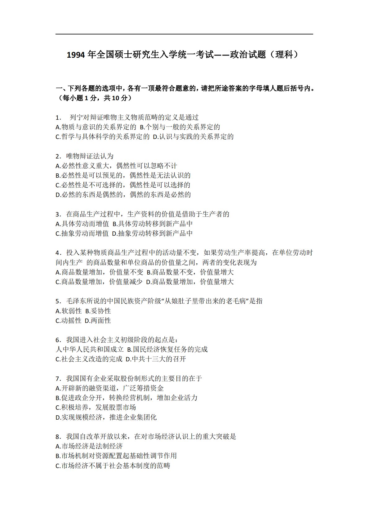 1994年全国硕士研究生入学统一考试——政治试题(理科)一、下列各题的选项中,各有一顶最符合题意的,请把所途答案的字母填人题后括号内。(每小题1分,共10分)1.列宁对辩证唯物主义物质范畴的定义是通过A.物质与意识的关系界定的B.个别与一般的关系界定的C.哲学与具体科学的关系界定的D.认识与实践的关系界定的2.唯物辩证法认为A.必然性意义重大,偶然性可以忽略不计B.必然性是可以预见的,偶然性是无法认识的C.必然性是不可选择的,偶然性是可以选择的D.必然的东西是偶然的,偶然的东西是必然的3.在商品生产过程中,生产资料的价值是借助于生产者的A.具体劳动而增值B.具体劳动转移到新产品中C.抽象劳动而...