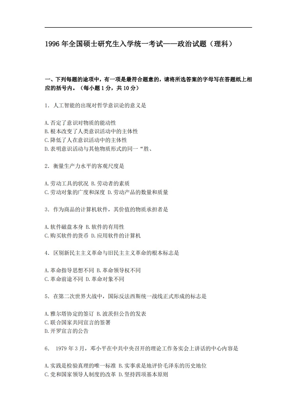 1996年全国硕士研究生入学统一考试——政治试题(理科)一、下列每题的途项中,有一项是最符合题意的,请将所选答案的字母写在答题纸上相应的括号内。(每小题1分,共10分)1.人工智能的出现对哲学意识论的意义是A.否定了意识对物质的能动性B.根本改变了人类意识活动中的主体性C.降低了人在意识活动中的主体性D.表明意识活动与其他物质形式的同一“胜、2.衡量生产力水平的客观尺度是A.劳动工具的状况B.劳动者的素质C.劳动对象的广度和深度D.劳动产品的数量和质量3.作为商品的计算机软件,其价值的物质承担者是A.软件磁盘本身B.软件的有用性C.购买软件的货币D.应用软件的计算机4.区别新民主主义革命与旧民...
