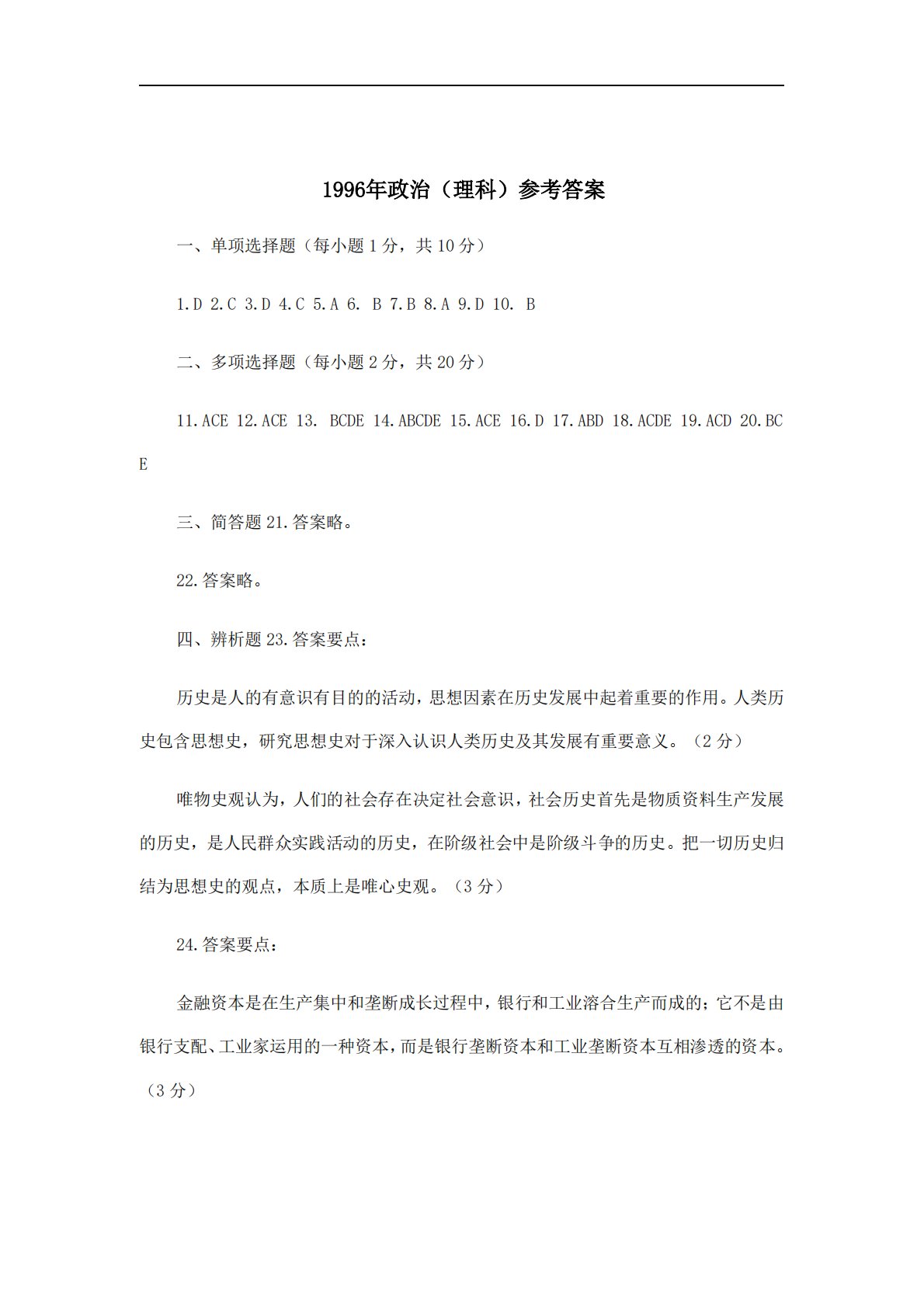 一、单项选择题(每小题1分,共10分)1.D2.C3.D4.C5.A6.B7.B8.A9.D10.B二、多项选择题(每小题2分,共20分)11.ACE12.ACE13.BCDE14.ABCDE15.ACE16.D17.ABD18.ACDE19.ACD20.BC1996ÄêÕþÖΣ¨Àí¿Æ£©参考答案E三、简答题21.答案略。22.答案略。四、辨析题23.答案要点:历史是人的有意识有目的的活动,思想因素在历史发展中起着重要的作用。人类历史包含思想史,研究思想史对于深入认识人类历史及其发展有重要意义。(2分)唯物史观认为,人们的社会存在决定社会意识,社会历史首先是物质资料生产发展的历史,是人民...