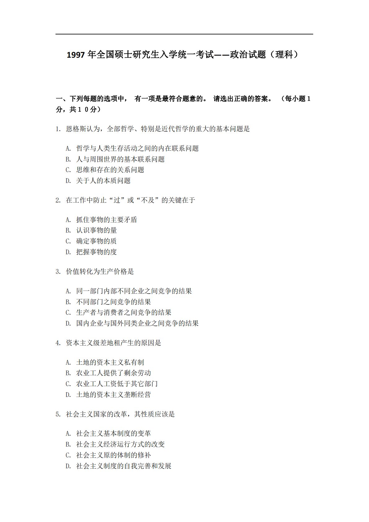 1997年全国硕士研究生入学统一考试——政治试题(理科)一、下列每题的选项中,有一项是最符合题意的。请选出正确的答案。(每小题1分,共10分)1.恩格斯认为,全部哲学、特别是近代哲学的重大的基本问题是A.哲学与人类生存活动之间的内在联系问题B.人与周围世界的基本联系问题C.思维和存在的关系问题D.关于人的本质问题2.在工作中防止“过”或“不及”的关键在于A.抓住事物的主要矛盾B.认识事物的量C.确定事物的质D.把握事物的度3.价值转化为生产价格是A.同一部门内部不同企业之间竞争的结果B.不同部门之间竞争的结果C.生产者与消费者之间竞争的结果D.国内企业与国外同类企业之间竞争的结果4.资本主义级...