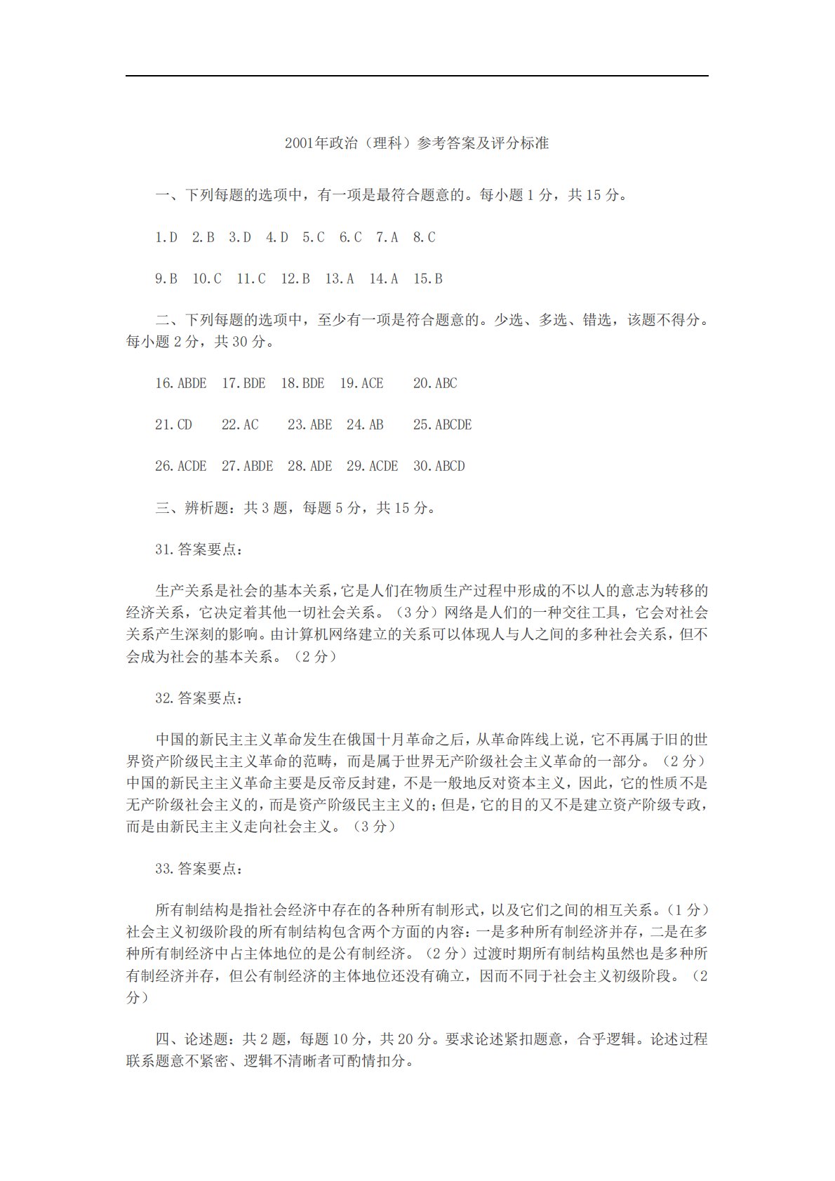 2001ÄêÕþÖΣ¨Àí¿Æ£©参考答案及评分标准一、下列每题的选项中,有一项是最符合题意的。每小题1分,共15分。1.D2.B3.D4.D5.C6.C7.A8.C9.B10.C11.C12.B13.A14.A15.B二、下列每题的选项中,至少有一项是符合题意的。少选、多选、错选,该题不得分。每小题2分,共30分。16.ABDE17.BDE18.BDE19.ACE20.ABC21.CD22.AC23.ABE24.AB25.ABCDE26.ACDE27.ABDE28.ADE29.ACDE30.ABCD三、辨析题:共3题,每题5分,共15分。31.答案要点:生产关系是社会的基本关系,它是人们在...