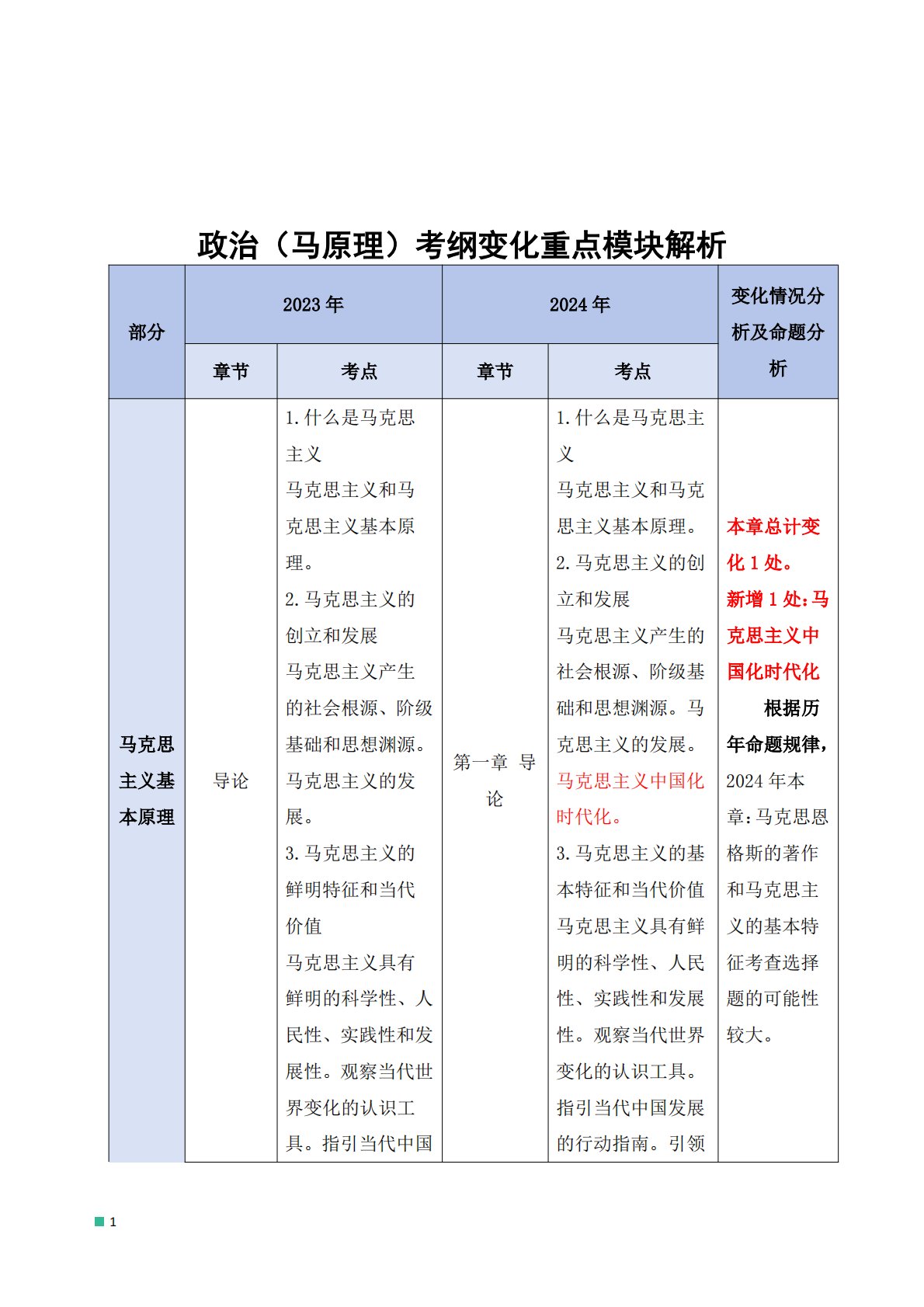 1政治(马原理)考纲变化重点模块解析部分2023年2024年变化情况分析及命题分析章节考点章节考点马克思主义基本原理导论1.什么是马克思主义马克思主义和马克思主义基本原理。2.马克思主义的创立和发展马克思主义产生的社会根源、阶级基础和思想渊源。马克思主义的发展。3.马克思主义的鲜明特征和当代价值马克思主义具有鲜明的科学性、人民性、实践性和发展性。观察当代世界变化的认识工具。指引当代中国第一章导论1.什么是马克思主义马克思主义和马克思主义基本原理。2.马克思主义的创立和发展马克思主义产生的社会根源、阶级基础和思想渊源。马克思主义的发展。马克思主义中国化时代化。3.马克思主义的基本特征和当代价值马...