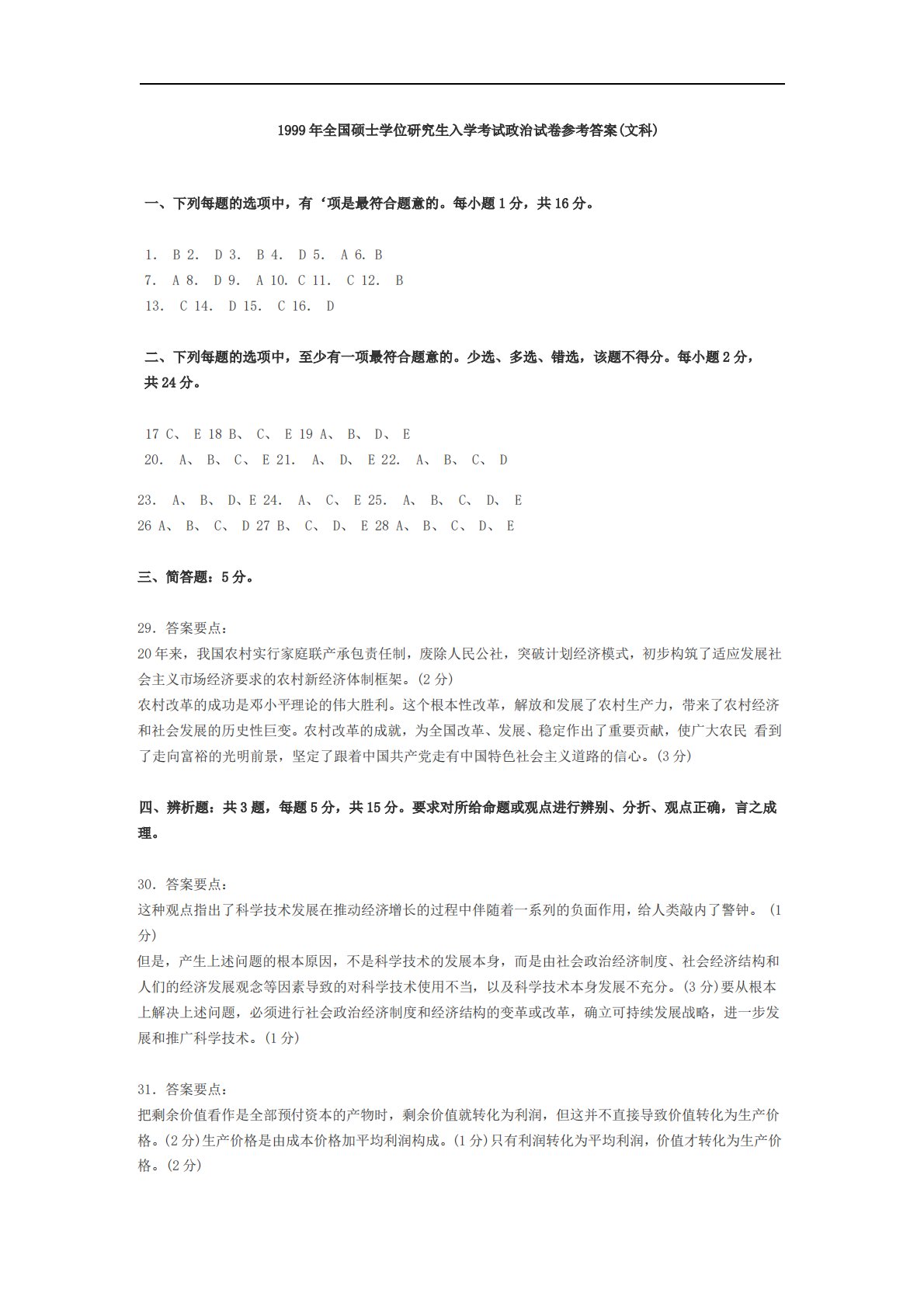 23.A、B、D、E24.A、C、E25.A、B、C、D、E26A、B、C、D27B、C、D、E28A、B、C、D、E三、简答题:5分。29.答案要点:20年来,我国农村实行家庭联产承包责任制,废除人民公社,突破计划经济模式,初步构筑了适应发展社会主义市场经济要求的农村新经济体制框架。(2分)农村改革的成功是邓小平理论的伟大胜利。这个根本性改革,解放和发展了农村生产力,带来了农村经济和社会发展的历史性巨变。农村改革的成就,为全国改革、发展、稳定作出了重要贡献,使广大农民看到了走向富裕的光明前景,坚定了跟着中国共产党走有中国特色社会主义道路的信心。(3分)四、辨析题:共3题,每题5分,共15分。...