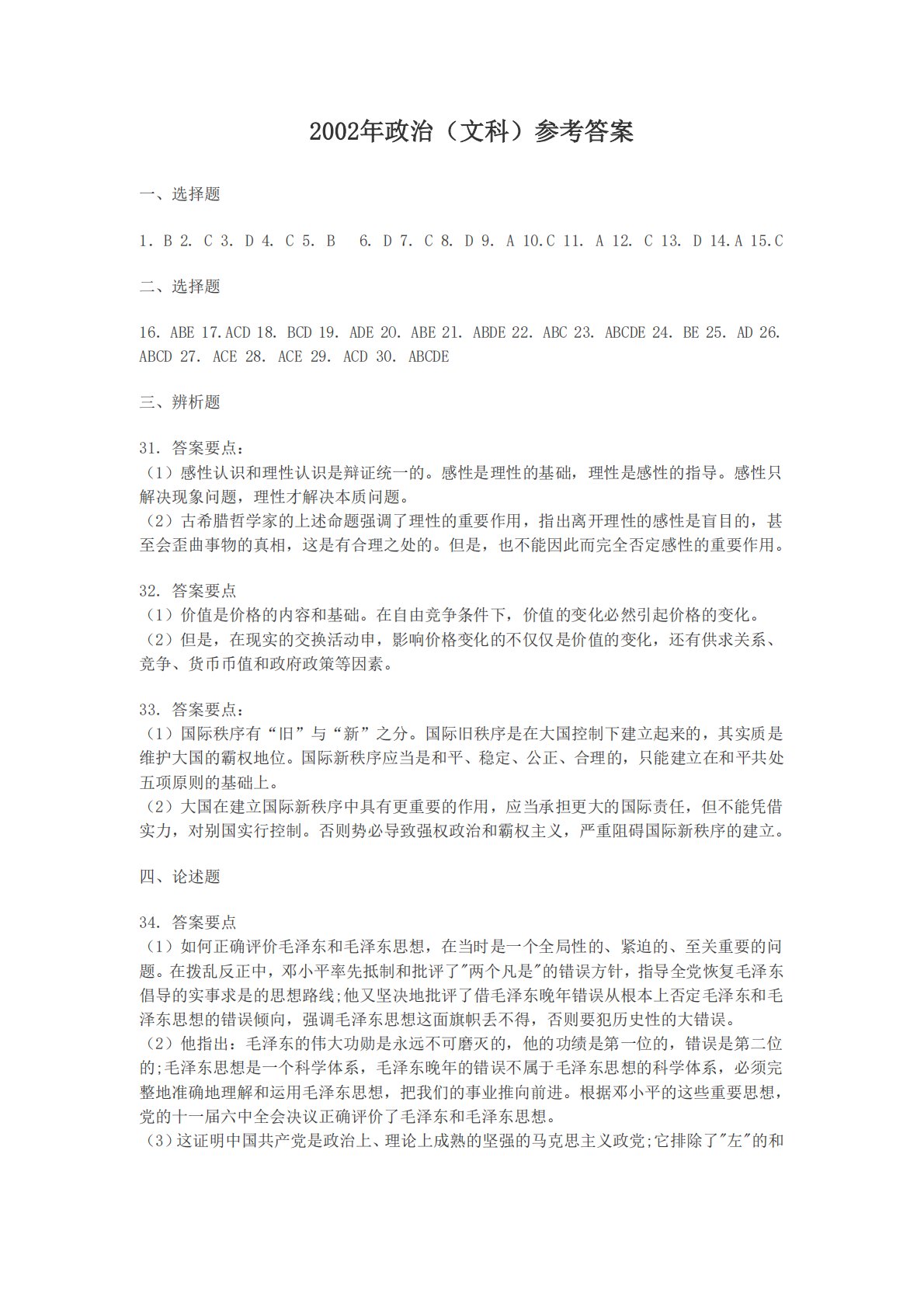 101政治(文科)2002年考研初试真题参考答案