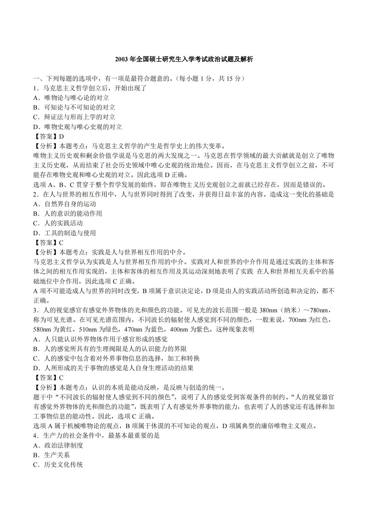 2003年全国硕士研究生入学考试政治试题及解析一、下列每题的选项中,有一项是最符合题意的。(每小题1分,共15分)1.马克思主义哲学创立后,开始出现了A.唯物论与唯心论的对立B.可知论与不可知论的对立C.辩证法与形而上学的对立D.唯物史观与唯心史观的对立【答案】D【分析】本题考点:马克思主义哲学的产生是哲学史上的伟大变革。唯物主义历史观和剩余价值学说是马克思的两大发现之一。马克思在哲学领域的最大贡献就是创立了唯物主义历史观,从而结束了社会历史领域中唯心史观的统治地位。因而,在马克思主义哲学创立之前,不可能存在唯物史观和唯心史观的对立。因此选项D正确。选项A、B、C贯穿于整个哲学发展的始终,即在...