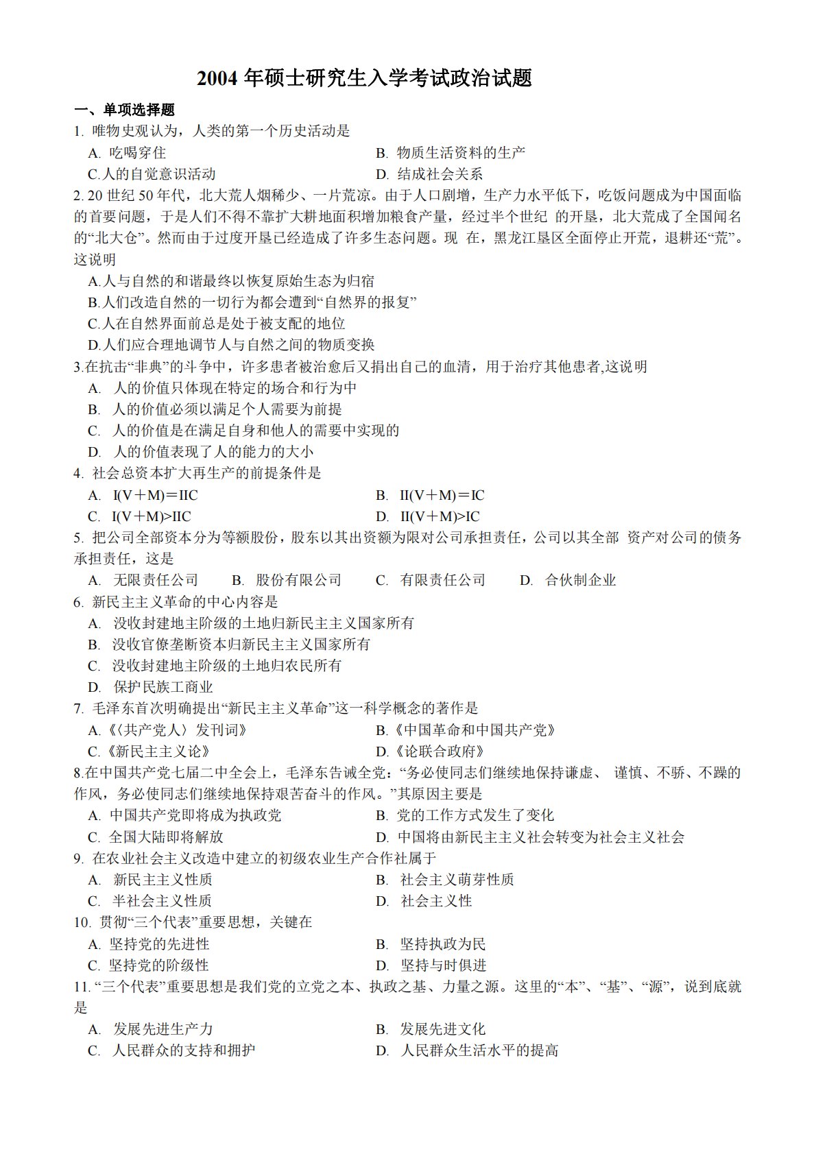 2004年硕士研究生入学考试政治试题一、单项选择题1.唯物史观认为,人类的第一个历史活动是A.吃喝穿住B.物质生活资料的生产C.人的自觉意识活动D.结成社会关系2.20世纪50年代,北大荒人烟稀少、一片荒凉。由于人口剧增,生产力水平低下,吃饭问题成为中国面临的首要问题,于是人们不得不靠扩大耕地面积增加粮食产量,经过半个世纪的开垦,北大荒成了全国闻名的“北大仓”。然而由于过度开垦已经造成了许多生态问题。现在,黑龙江垦区全面停止开荒,退耕还“荒”。这说明A.人与自然的和谐最终以恢复原始生态为归宿B.人们改造自然的一切行为都会遭到“自然界的报复”C.人在自然界面前总是处于被支配的地位D.人们应合理地...