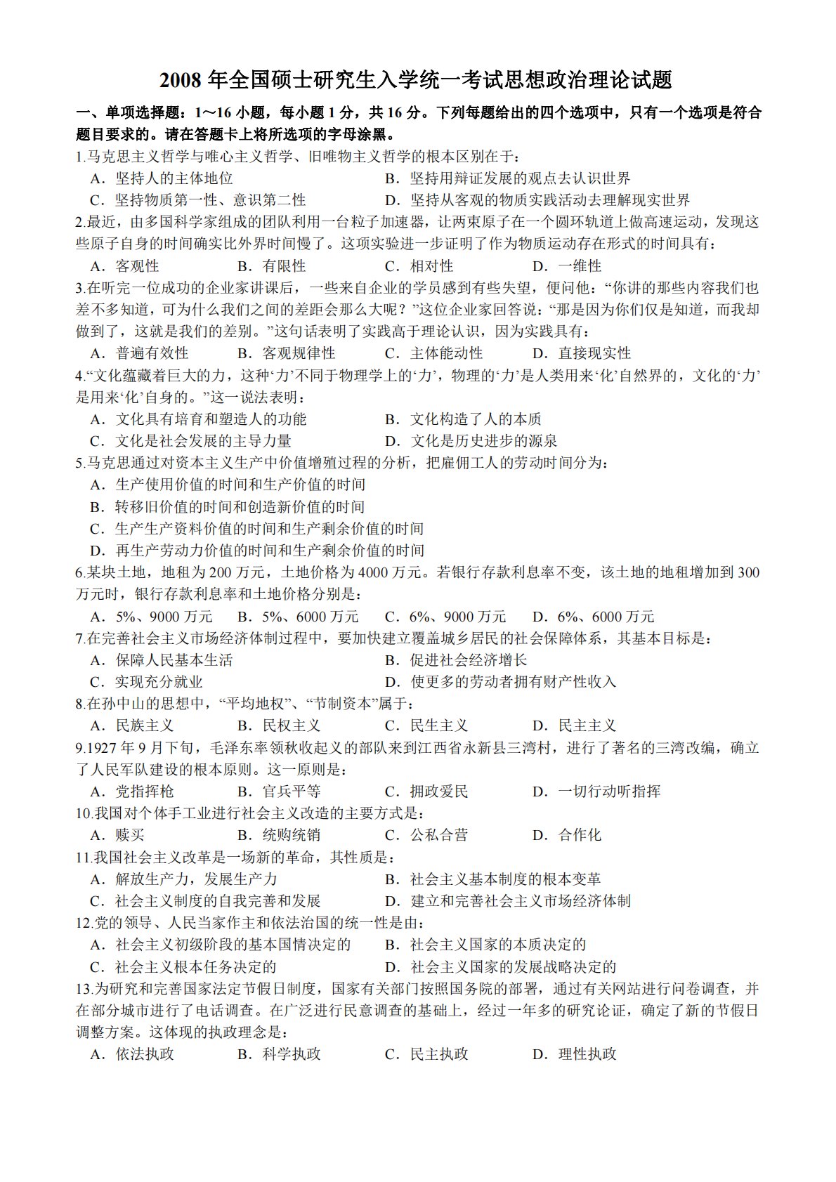 2008年全国硕士研究生入学统一考试思想政治理论试题一、单项选择题:1~16小题,每小题1分,共16分。下列每题给出的四个选项中,只有一个选项是符合题目要求的。请在答题卡上将所选项的字母涂黑。1.马克思主义哲学与唯心主义哲学、旧唯物主义哲学的根本区别在于:A.坚持人的主体地位B.坚持用辩证发展的观点去认识世界C.坚持物质第一性、意识第二性D.坚持从客观的物质实践活动去理解现实世界2.最近,由多国科学家组成的团队利用一台粒子加速器,让两束原子在一个圆环轨道上做高速运动,发现这些原子自身的时间确实比外界时间慢了。这项实验进一步证明了作为物质运动存在形式的时间具有:A.客观性B.有限性C.相对性D....
