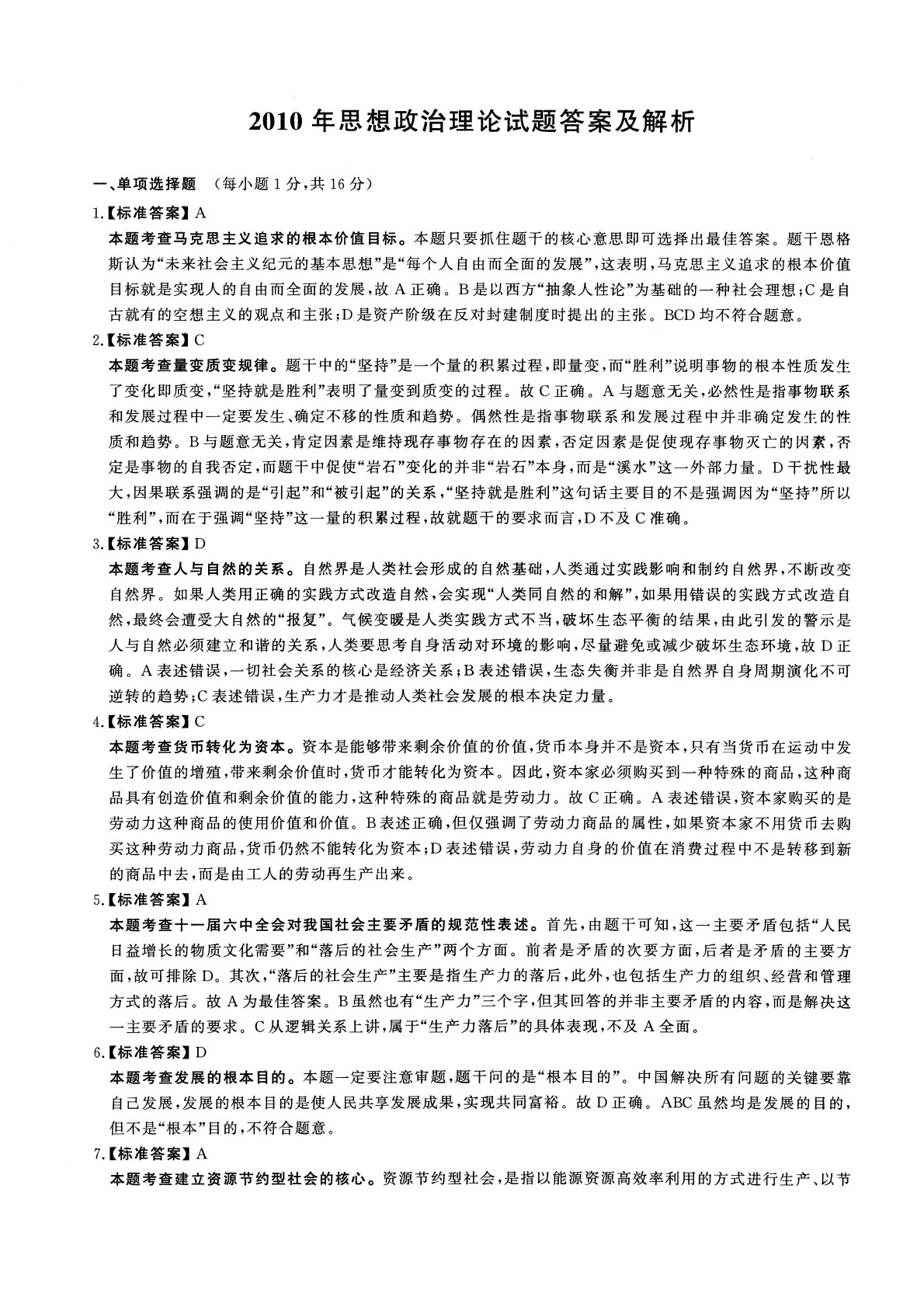 2010年思想政治理论试题答案及解析一、单项选择题(每小题1分,共16分)1.【标准答案】A本题考查马克思主义追求的根本价值目标。本题只要抓住题干的核心意思即可选择出最佳答案。题干恩格斯认为“未来社会主义纪元的基本思想”是“每个人自由而全面的发展'勹这表明,马克思主义追求的根本价值目标就是实现人的自由而全面的发展,故A正确。B是以西方“抽象人性论”为基础的一种社会理想;C是自古就有的空想主义的观点和主张;D是资产阶级在反对封建制度时提出的主张。BCD均不符合题意。2.[标准答案]C本题考查量变质变规律。题干中的“坚持”是一个量的积累过程,即量变,而“胜利”说明事物的根本性质发生了变化即质变,“...