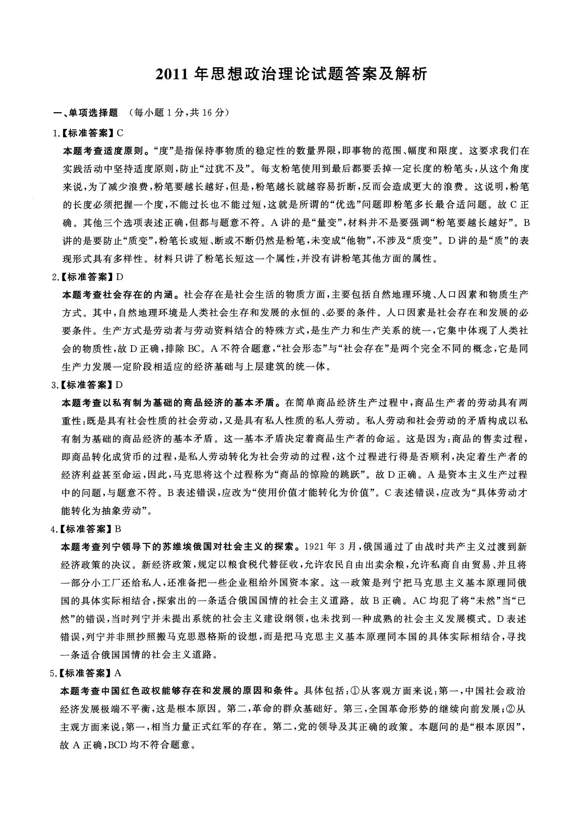 2011年思想政治理论试题答案及解析一、单项选择题(每小题1分,共16分)1.【标准答案】C本题考查适度原则。“度”是指保持事物质的稳定性的数量界限,即事物的范围、幅度和限度。这要求我们在实践活动中坚持适度原则,防止“过犹不及”。每支粉笔使用到最后都要丢掉一定长度的粉笔头,从这个角度来说,为了减少浪费,粉笔要越长越好,但是,粉笔越长就越容易折断,反而会造成更大的浪费。这说明,粉笔的长度必须把握一个度,不能过长也不能过短,这就是所谓的“优选”问题即粉笔多长最合适问题。故C正确。其他三个选项表述正确,但都与题意不符。A讲的是”量变'勹材料并不是要强调”粉笔要越长越好”。B讲的是要防止“质变'勹粉笔...